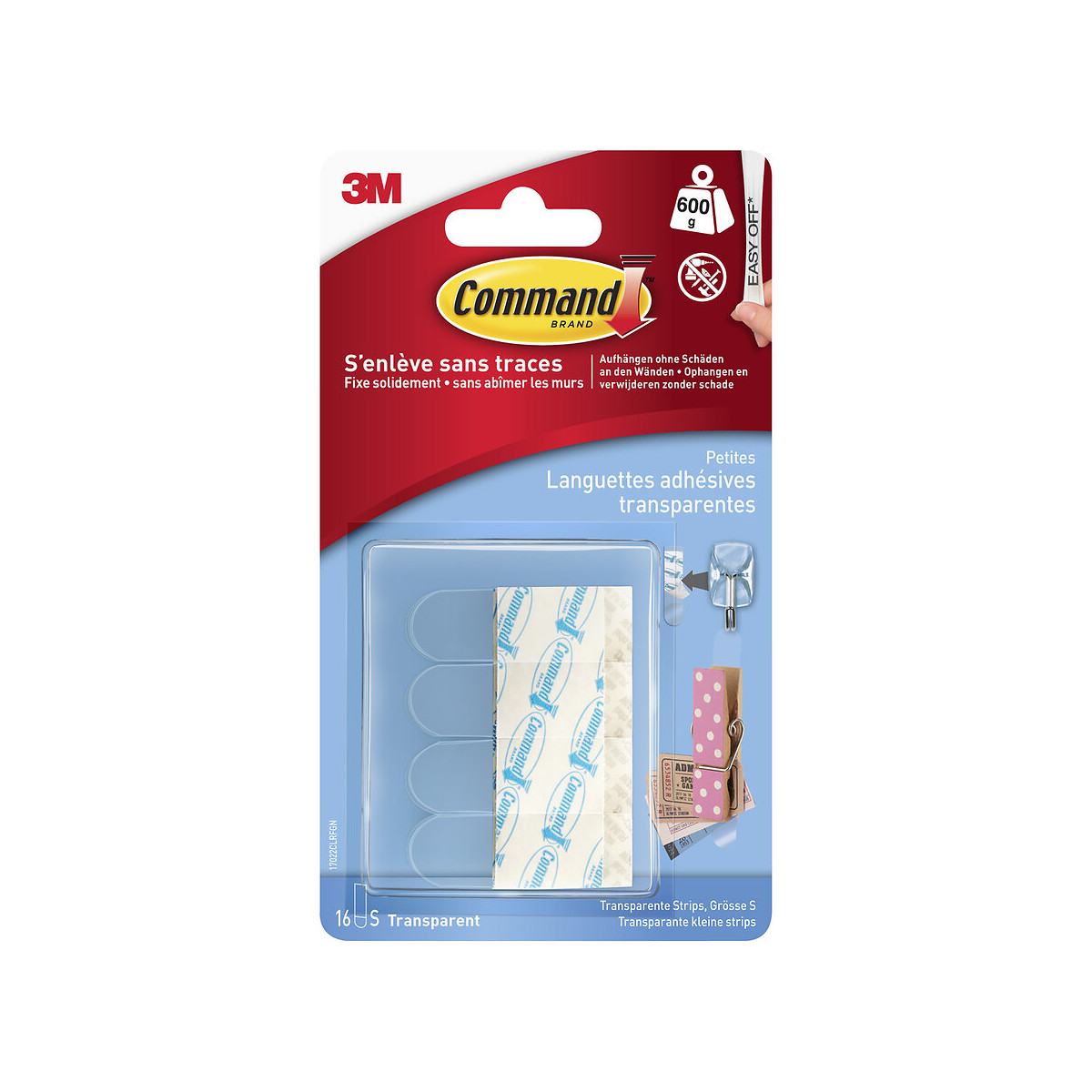 16 languettes de fixation adhésives enlevables transparentes petit modèle - Charge maximale supportée : 225g - Les languettes de fixation transparentes Command™ permettent de déplacer et de raccrocher facilement vos produits Command™ et objets/accessoires pour les changements de décoration, la réorganisation ou lors d'un déménagement. Ces languettes peuvent être utilisées comme recharge pour les crochets Command™ ou pour accrocher des objets plats avec une profondeur maximale de 2cm. Comme tous les produits Command™, elles s'accrochent solidement sur différentes surfaces, notamment les surfaces carrelées, en bois, en métal et peintes. De plus, elles s'enlèvent proprement en ne laissant ni trou, ni marque, ni résidu collant. Les languettes transparentes Command™ existent en petit et grand format. Elles sont aussi idéales pour remplacer le ruban adhésif double-face. Elles se fixent solidement et se retirent sans laisser de trace.Spécifications techniques