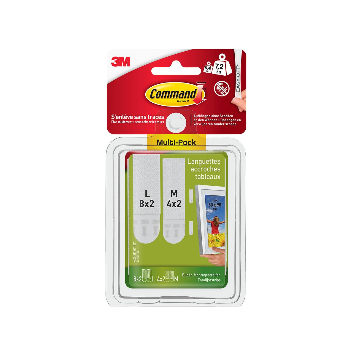 Assortiment de 4 paires de 2 languettes de fixation adhésives enlevables tableau moyen modèle blanc - charge maximale supportée : 5.4 kg + 8 paires de 2 languettes de fixation adhésives enlevables tableau grand modèle blanc - charge maximale supportée : 7.2 kg - Avec la technologie Command™, oubliez les clous, vis, punaises qui abîment les murs ! Les languettes adhésives Accroches Tableaux Command™ permettent de fixer les cadres, simplement et solidement, sans outil, sans trou et sans trace. De plus, elles permettent la fixation des tableaux sur de nombreux supports (carrelage, murs peints, mélaminé, inox ...). Le système de fermeture en picots Command™ permet de fixer solidement mais aussi de décrocher et repositionner les cadres à volonté, favorisant selon vos envies et besoins une décoration nomade et ludique. Lorsque vous êtes prêts à retirer ou déplacer vos tableaux, elles se retirent proprement , pas de trous, de marques ou de résidus collants.Spécifications techniques