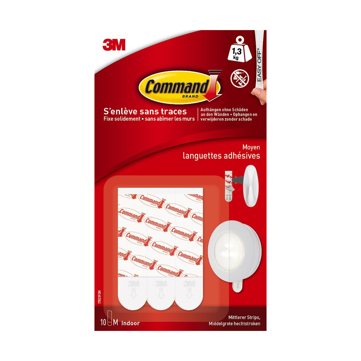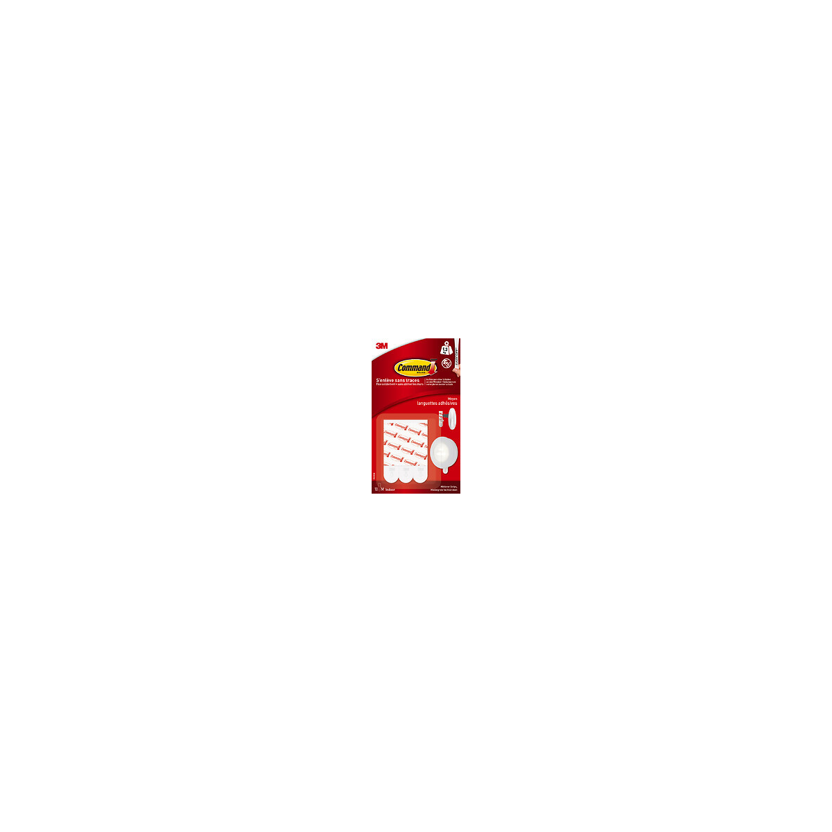 10 languettes enlevables standard blanc Command™ moyen modèle - Charge maximale supportée : 1,3 kg - Les languettes de fixation Command™ permettent de déplacer et de raccrocher facilement vos produits Command™ et objets/accessoires pour les changements de décoration, la réorganisation ou lors d'un déménagement. Ces languettes peuvent être utilisées comme recharge pour les crochets Command™ ou pour accrocher des objets plats avec une profondeur maximale de 2cm. Comme tous les produits Command™, elles s'accrochent solidement sur différentes surfaces, notamment les surfaces carrelées, en bois, en métal et peintes. De plus, elles s'enlèvent proprement en ne laissant ni trou, ni marque, ni résidu collant. Les languettes Command™ existent en petit et grand format. Elles sont aussi idéales pour remplacer le ruban adhésif double-face. Elles se fixent solidement et se retirent sans laisser de trace.Spécifications techniques