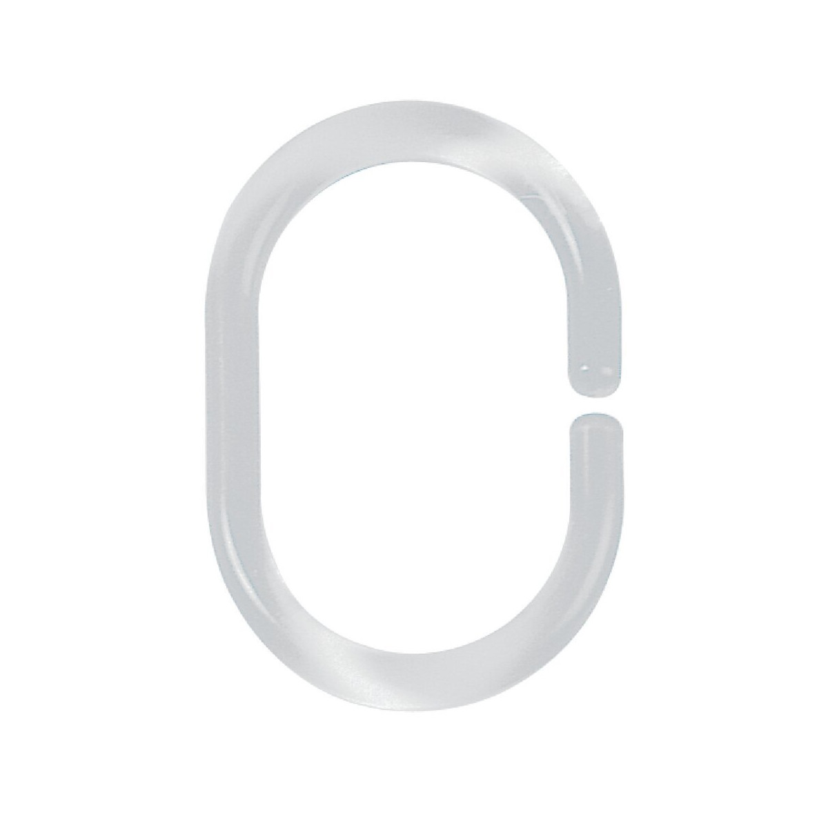 Anneaux Minor pour rideau de douche en matière plastique. Coloris transparent clair. Largeur 4cm. Hauteur 5.8cm. Epaisseur 0.5cm. Lot de 12 pièces.Spécifications techniques