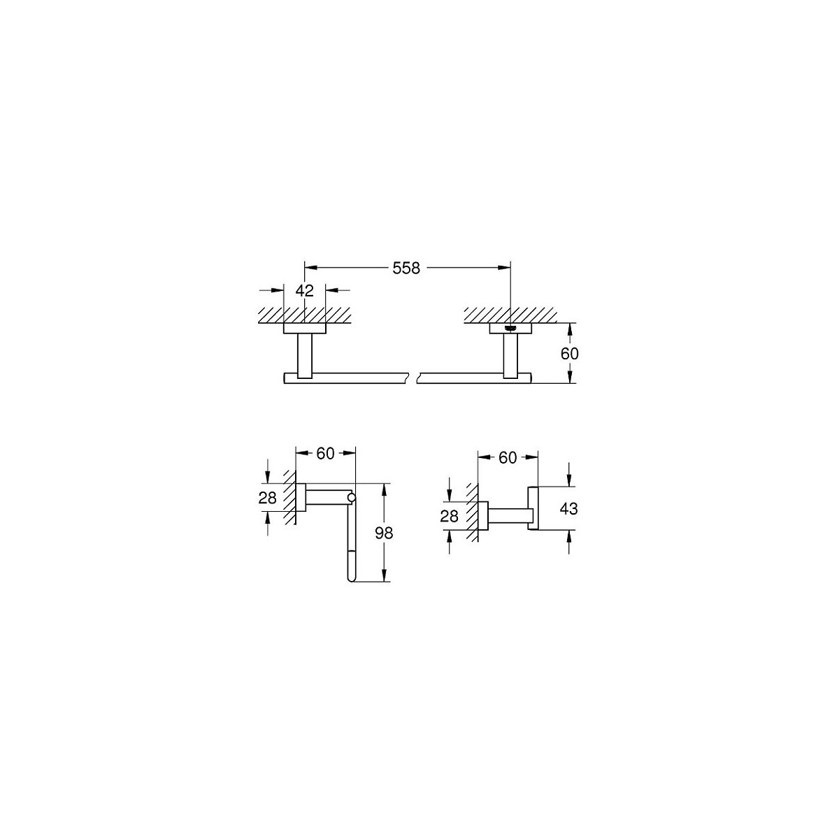 Caractéristiques techniques du set d accessoires Essentials Cube 40777001 Set d’accessoires 3 en 1 composé de : Métal Patère murale (40 511 001) Dérouleur de papier (40 507 001) Barre porte serviette 558 mm (40 509 001) Fixations encastrées GROHE StarLight Chrome éclatant et durableSpécifications techniques