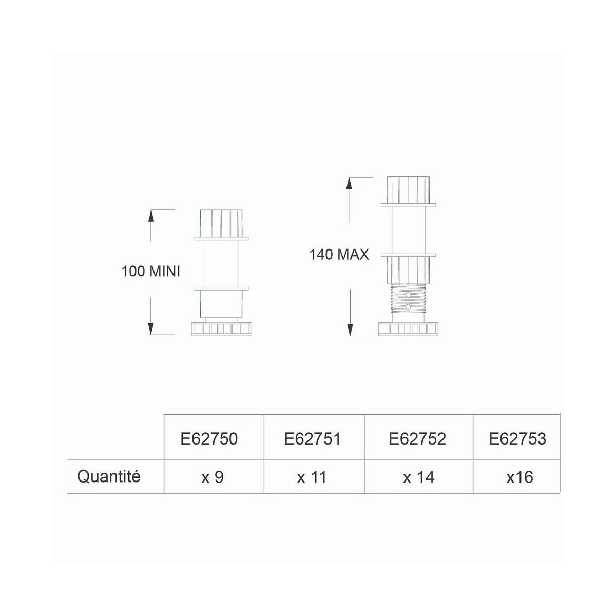 Les kits de réhausse pour receveur Flight Pure Jacob Delafon sont indispensable pour vos installations de receveur à surrélever. Caractéristiques : Simplicité et rapidité d installation pour surrélever le receveur Offre la stabilité pour le receveur Taille réglable en hauteur de 10 à 14 cm Le kit de réhausse ne donne pas la nécéssité de faire des travaux de maçonnerie, le système d évacuations s installant directement entre le receveur et le sol Dimensions l x L en cm pour un pied du kit : 10 x 4.8 cm Le kit de réhausse est disponible en version : 9, 11, 14 et 16 pieds (à choisir en fonction de la taille de votre receveur) Garantie : 2 ans Dimensions disponibles : kit de réhausse 9 pieds pour receveur Jacob Delafon Flight Pure ( convient aux receveurs 80 et 90 cm ) / Ref : E62750-00 kit de réhausse 11 pieds pour receveur Jacob Delafon Flight Pure ( convient aux receveurs 100 et 120 cm ) / Ref : E62751-00 kit de réhausse 14 pieds pour receveur Jacob Delafon Flight Pure ( convient aux receveurs 140 et 160 cm ) / Ref : E62752-00 kit de réhausse 16 pieds pour receveur Jacob Delafon Flight Pure ( convient aux receveurs 170 et 180 cm ) / Ref : E62753-00Spécifications techniques