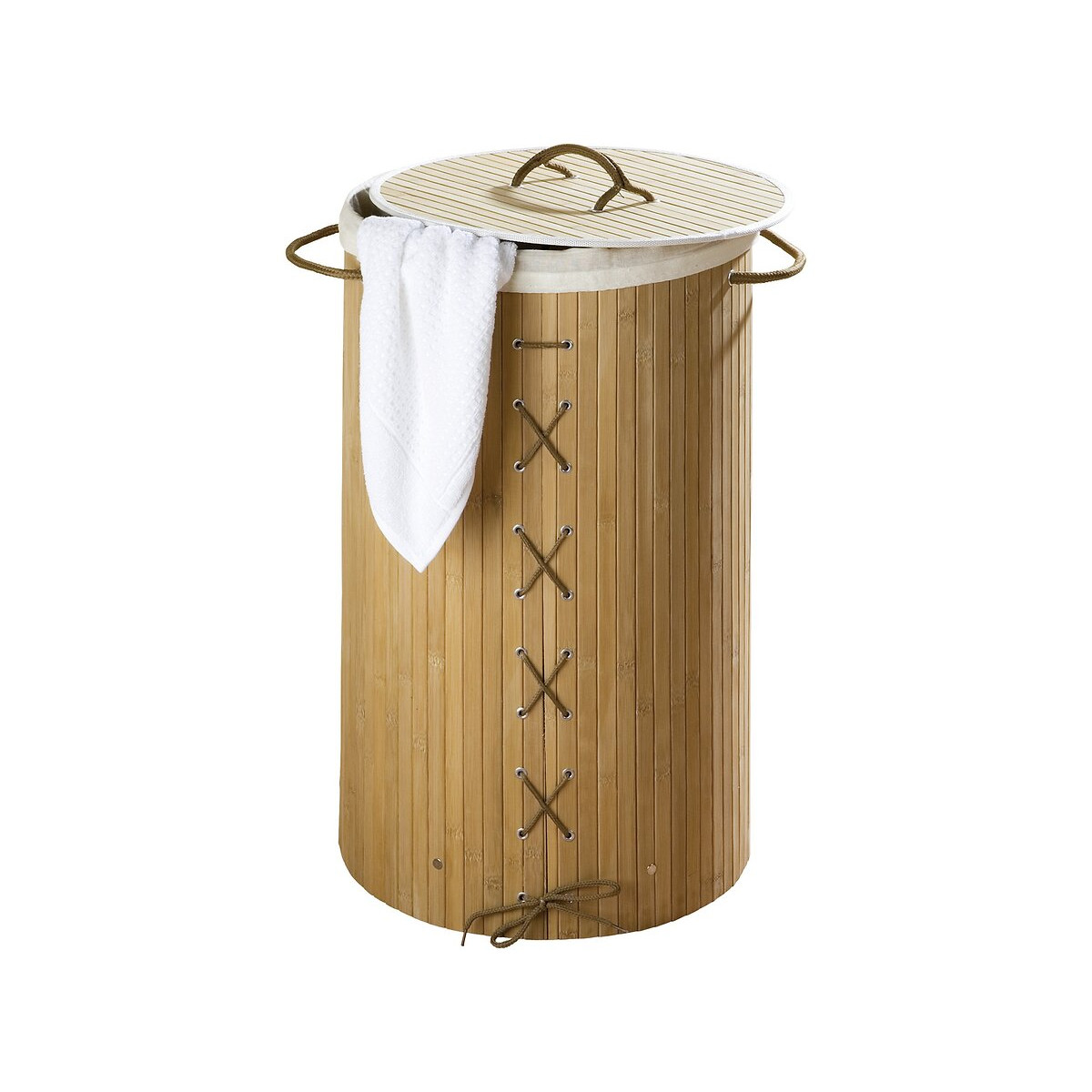 Coffre à linge Bambou naturel avec couvercle. Sac à linge amovible intégré coloris crème, lavable à 30°C maximum. Composition du sac : 100% coton. Cadre : 100% polyester. Montage simple et rapide grâce au nouveau fond clipsé. Capacité : 55 L. Dimensions : Hauteur 60 cm x Diamètre 35 cm.