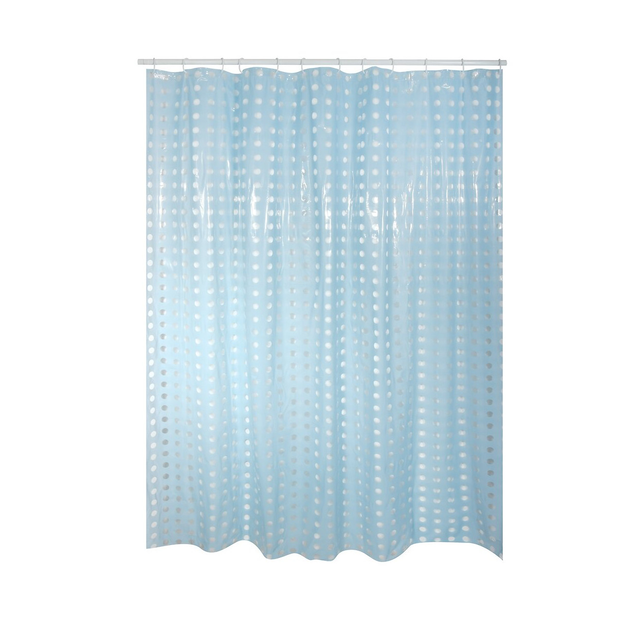 Rideau de douche en PVC. Coloris : bleu ciel à pois transparents. Dimensions : Largeur 180 cm x Hauteur 200 cm.Spécifications techniques