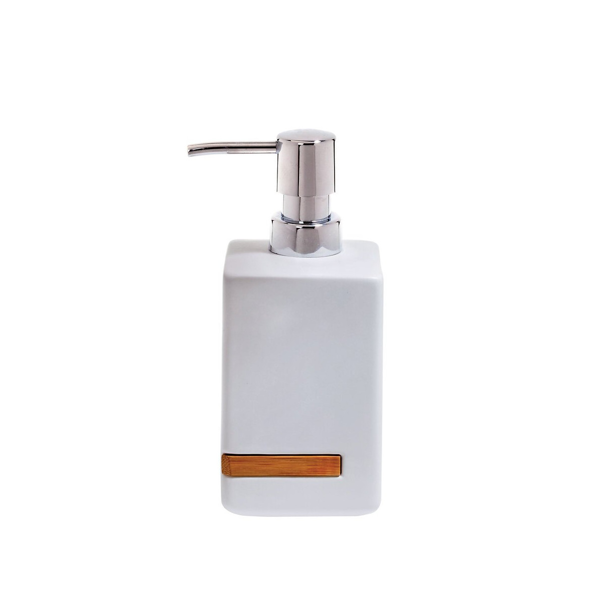 Distributeur de savon liquide Oslo à poser en matière stoneware et bambou. Coloris blanc. Distribution du savon par appui sur la pompe. La pompe en matière plastique finition chromée se dévisse pour permettre le remplissage. Contenance : 0,3L. Largeur 7,5cmxHauteur 17,9cm.Spécifications techniques