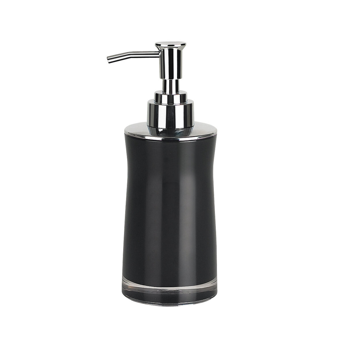 Distributeur de savon liquide Sydney à poser en acrylique. Coloris noir. Distribution du savon par appui sur la pompe. La pompe en matière plastique ABS finition chromée se dévisse pour permettre le remplissage. Contenance : 0,2L. Diamètre 7cm.Hauteur 18,5cm.Spécifications techniques