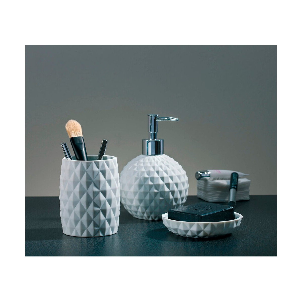 Distributeur de savon liquide Alison à poser en porcelaine. Coloris blanc. Décor géométrique en relief. Distribution du savon par appui sur la pompe. La pompe en matière plastique finition chromée se dévisse pour permettre le remplissage. Contenance : 0.3L. Diamètre 11cm. Hauteur 17cm.