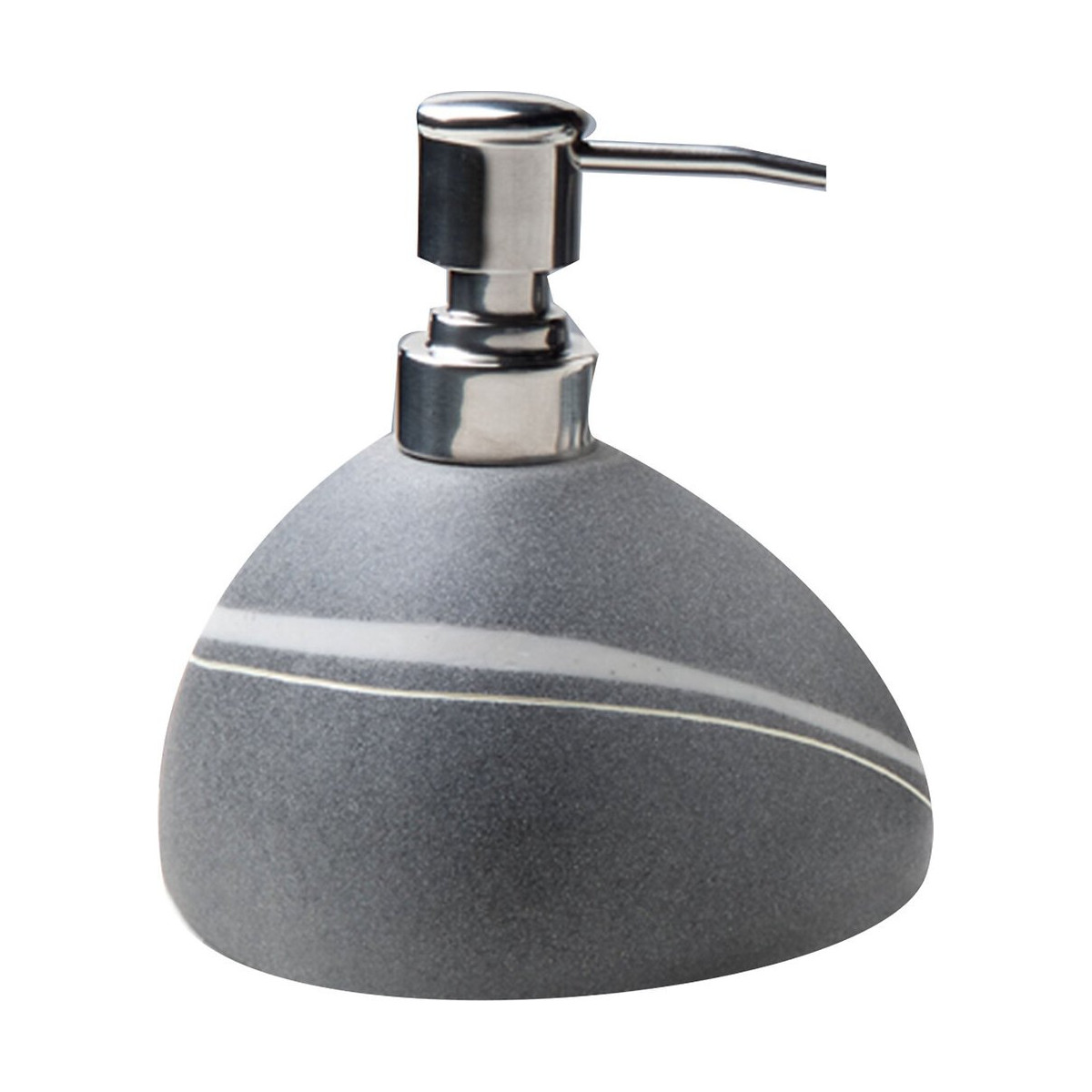 Distributeur de savon liquide Ecosse en résine. Coloris : gris. Pompe en plastique. A coordonner avec le reste de la gamme Ecosse : porte-savon et gobelet. Dimensions : Longueur 12 cm x Profondeur 10 cm x Hauteur 15 cm.Spécifications techniques