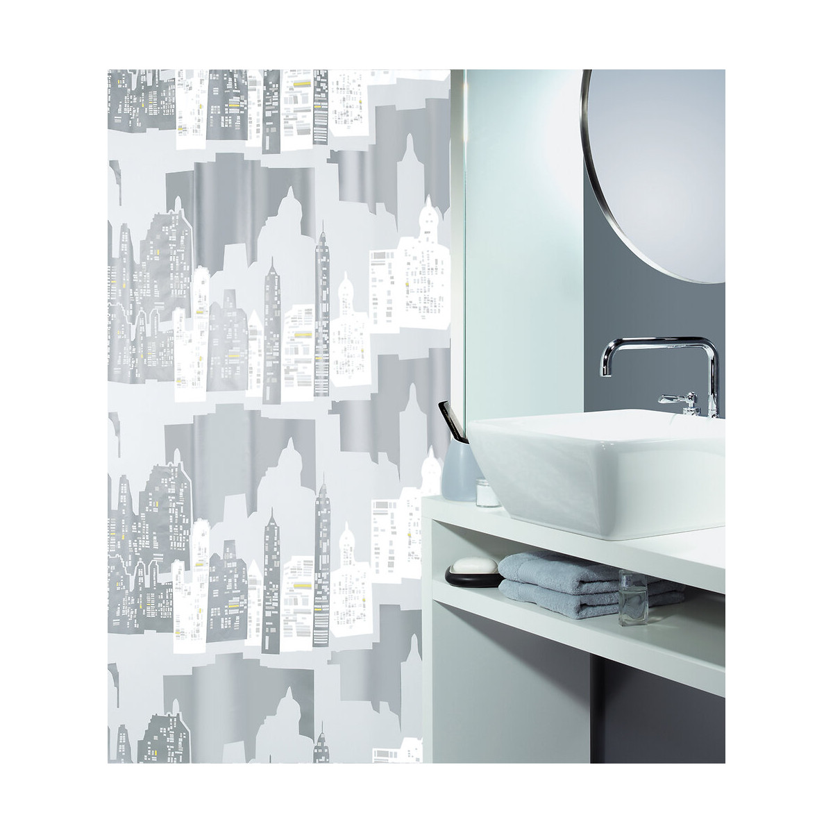 Rideau de douche Bronx 100% PEVA. Coloris silver. Équipé de 12 œillets (anneaux vendus séparément). Lavable à la main. Largeur 180 cm x Hauteur 200 cm.