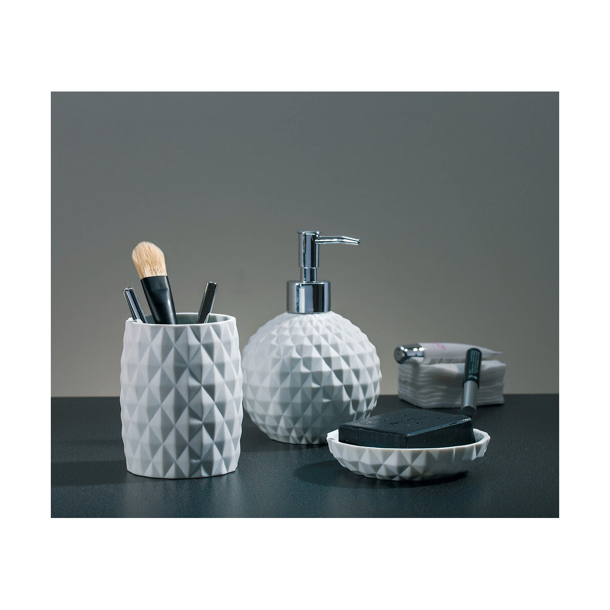 Porte-savon Alison à poser en matière porcelaine. Coloris blanc. Décor géométrique en relief. Diamètre 11cm. Hauteur 2cm.Spécifications techniques