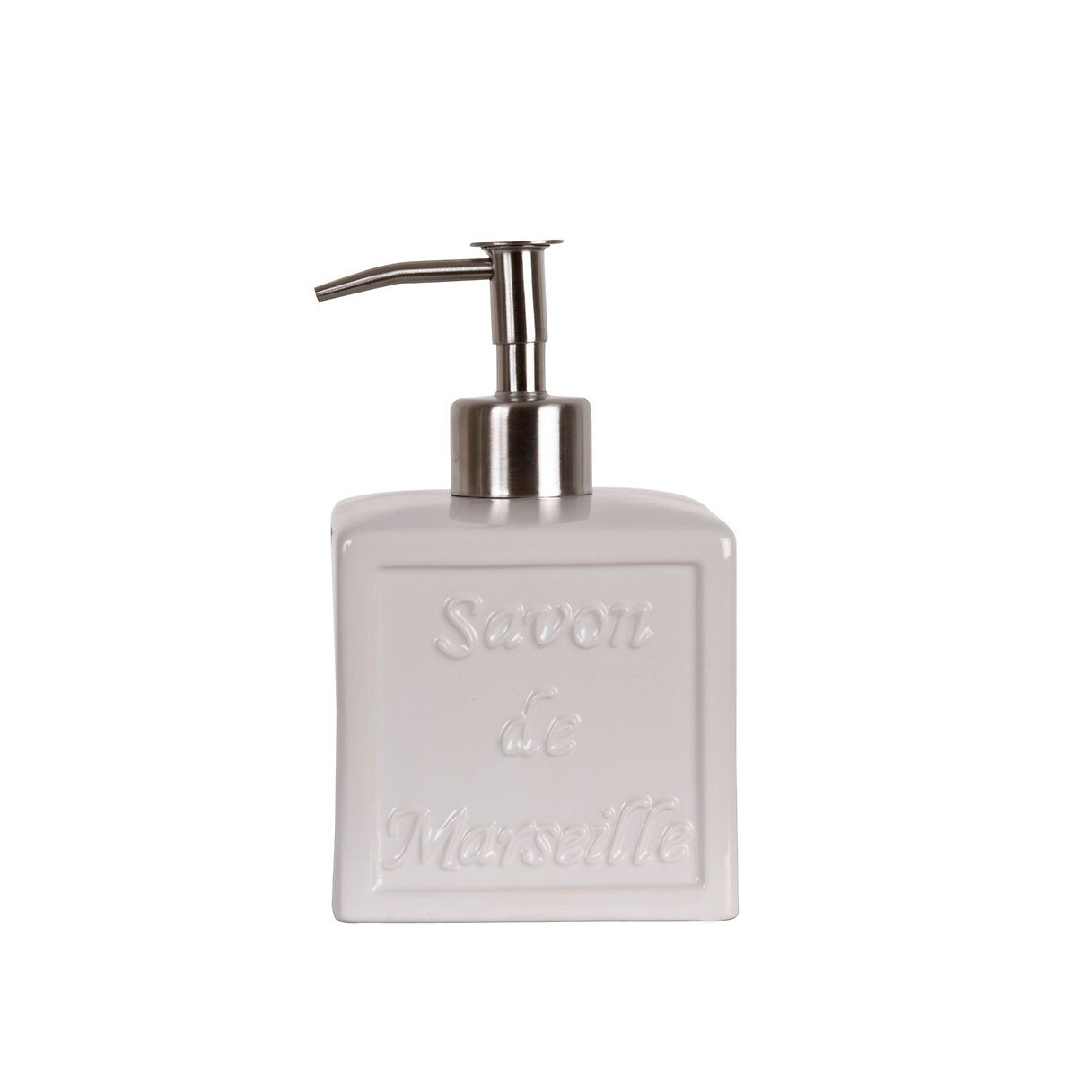 Distributeur de savon liquide Savon de Marseille à poser en matière stoneware peint à la main. Coloris blanc. Décor relief marque déposée "Savon de Marseille". Distribution du savon par appui sur la pompe. La pompe en métal se dévisse pour permettre le remplissage. Contenance : 0,3L. Dimensions : Largeur 9cmxHauteur 15cm.Spécifications techniques