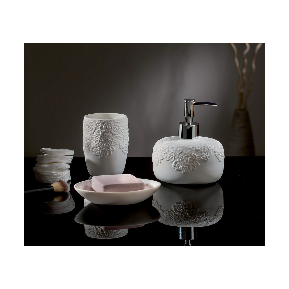 Porte-savon Cosy à poser en porcelaine. Coloris blanc finition mat. Décor dentelle en relief. Dimensions : Largeur 13cmxHauteur 2,5cm.Spécifications techniques