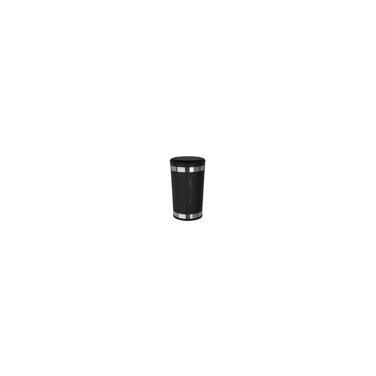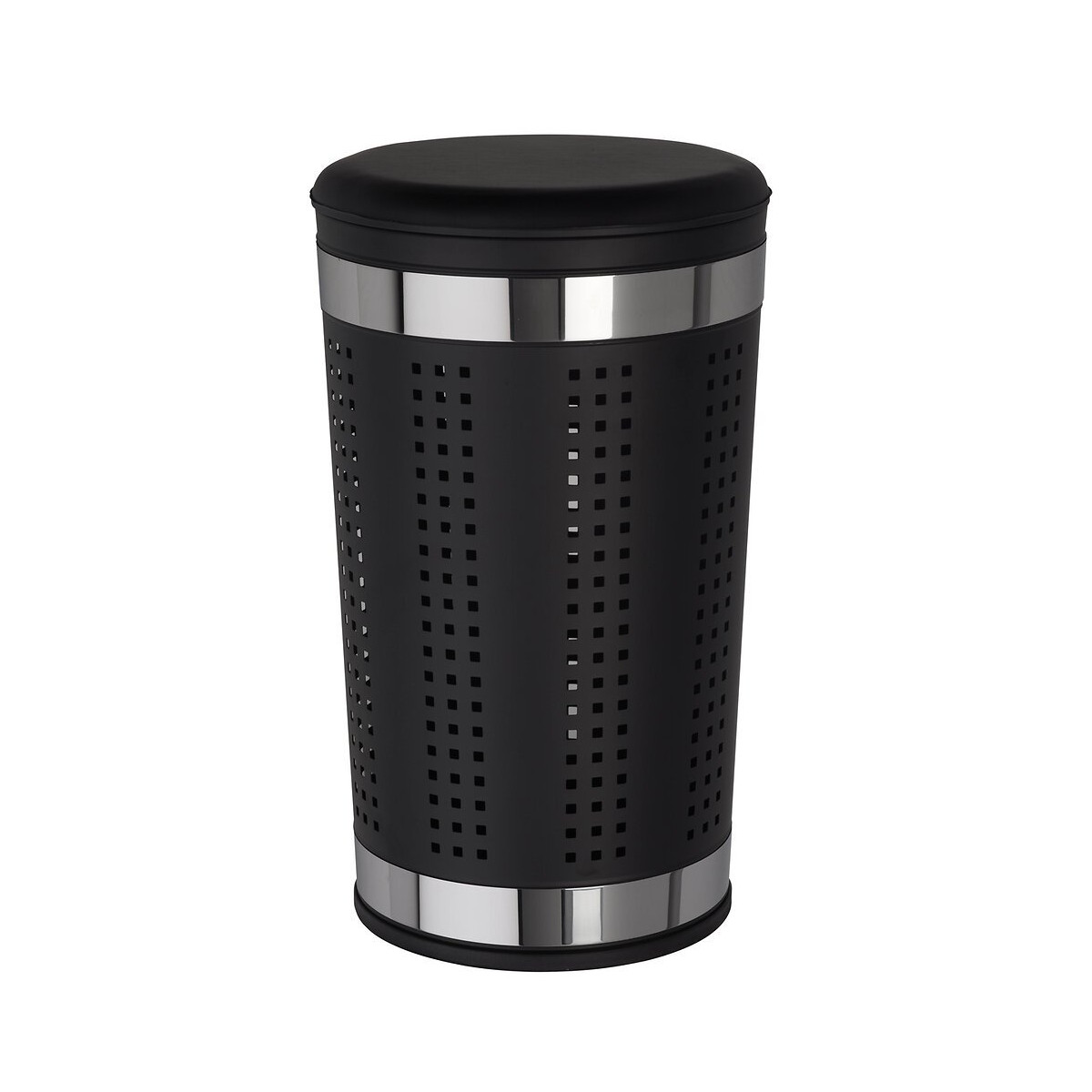 Panier à linge en métal perforé coloris noir et assise en simili cuir Caractéristiques : Couvercle siège. Dimensions : diamètre 35cm - hauteur 55cm. Usage : permet de range son linge mais aussi de s'asseoir.Spécifications techniques