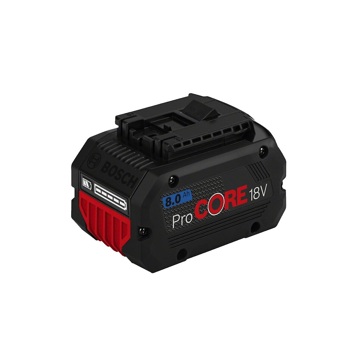 Batterie BOSCH GBA 18V 8,0 Ah ProCORE - 87 % de puissance en plus par rapport à une batterie conventionnelle : grâce à la technologie de cellules nouvelle génération et à la gestion de batterie intelligente Bosch - Système d'alimentation flexible : 100% compatible avec tous les outils électriques Bosch Professional nouveaux et existants de la gamme 18 V - Longévité 135 % plus élevée qu'une batterie standard grâce à la technologie COOLPACK 2.0 évitant tout risque de surchauffe