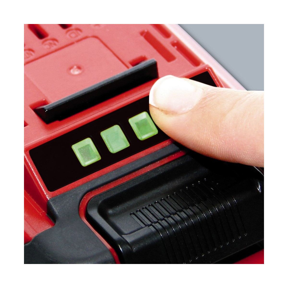 Système de batterie pour tous les outils de la gamme Power X-Change 7en 1 ABS: Le système actif de gestion de la batterie Einhell Témoin LED du niveau de charge de la batterie, 3 positions Gestion et contrôle permanents de la température, de la tension etc.. Recharge progressive lors d’une décharge totale ce qui garantit une longue durée de vie Des cellules Lithium-Ion haut de gamme empêchent l’auto-décharge totale Rechargeable à tout moment Le boîtier en caoutchouc est anti-chocs et lui donne une bonne stabilité La batterie s’enlève et se fixe aisément grâce à des encoches ergonomiques Capacité accrue de la batterie : plus puissante, plus grande autonomie Caractéristiques techniques : Batterie : 18 V | 5200 mAh | Li-Ion Nombre de batterie : 1Spécifications techniques