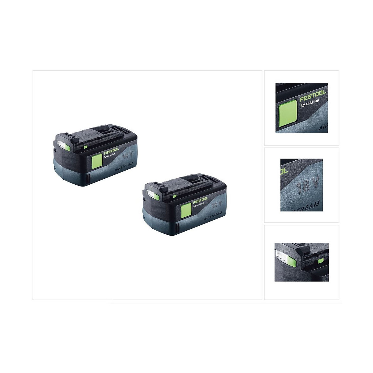 Contenu du paquet: - 2x Batteries Festool BP 18 Li 5,2 AS 18V 5,2 Ah Li-Ion ( 200181 ) Description du produit: La batterie Festool BP 18 Li 5.2 AS 18V 5,2 Ah est le complément idéal de votre batterie lithium-ion 18V Festool et, avec une capacité de 5,2 Ah, elle peut être utilisée pendant une très longue période sans recharge. besoin. Avec la nouvelle technologie Airstream de Festool, les batteries peuvent désormais être réutilisées encore plus rapidement car elles sont refroidies en permanence avec de l'air. Un indicateur de charge de batterie supplémentaire permet de lire facilement la capacité restante de la batterie. Le boîtier est équipé d'un cadre en caoutchouc robuste qui garantit une protection optimale et un support sûr sur les surfaces inclinées, telles que les toits. Cette batterie est parfaitement adaptée à tous les appareils lithium-ion Festool devant supporter des exigences élevées en matière de puissance et une longue durée de vie de la batterie. Spécifications techniques: Capacité de la batterie: 5,2 Ah Tension de la batterie: 18 V Poids de la batterie: 710 g Temps de charge (avec TCL 3): 90 Min. Temps de charge (avec TCL 6): 60 Min. Temps de charge (avec SCA 8): 40 Min.