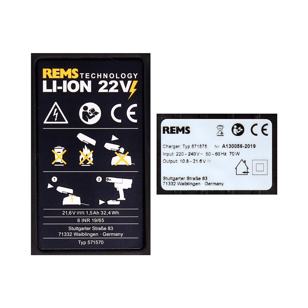 Contenu du paquet: - 1x Batterie REMS Li-Ion 21,6 V (571570 R22). - 1x Chargeur REMS 90 W (571585). Description du produit : Cette batterie et ce chargeur sont légers, puissants et robustes pour équiper les outils REMS 22 V. La batterie de 21,6 V offre 50 % d'expansion en plus que les batteries Li-Ion de 14,4 V. Elle assure environ 200 sertissages de Viega Profipress DN 15 par charge. Son indicateur de niveau de charge gradué indique le niveau de charge de la batterie à l'aide de 4 LED. Après avoir appuyé sur le bouton portant le symbole de la batterie, au moins une LED s'allume pendant quelques secondes. Plus il y a de LED qui s'allument en vert, plus le niveau de charge de la batterie est élevé. Si une LED clignote en rouge, la batterie doit être rechargée. L'absence d'effet mémoire et la surveillance de la température pendant le processus de charge garantissent toujours une performance optimale de la batterie. Grâce à sa fonction de charge rapide, les batteries sont rechargées en peu de temps. Le chargeur doté d'une protection contre la surchauffe et la surcharge garantit une plus longue durée de vie des batteries. L'indicateur de niveau de charge gradué indique le niveau de charge de la batterie à l'aide de 4 LED. Si un voyant de contrôle indique une lumière rouge continue, la température du chargeur rapide et/ou de la batterie excède la plage de fonctionnement autorisée du chargeur rapide de 0 °C à +40 °C. Spécifications techniques : Tension nominale : 230 V/21,6 V Tension de charge finale : 22 V Capacité de la batterie : 1,5 Ah Puissance : 32,4 Wh Plage de température de travail : -10 à +60°C Dimensions : (Lxlxh) : 130x75x50 mm Poids : 450 g Compatibilité des batteries et des produits : Produuits 1,5 Ah Batterie 2,5 Ah Batterie REMS Mini-Press 22 V ACC oui oui REMS Mini-Press S 22 V ACC oui oui REMS Akku-Press 22 V ACC oui oui REMS Ax-Press 25 22 V ACC oui oui REMS Ax-Press 25 L 22 V ACC oui oui REMS Ax-Press 30 22 V ACC oui oui REMS Akku-Ex-Press Cu 22 V ACC oui oui REMS Akku-Ex-Press P 22 V ACC oui oui REMS Akku-Ex-Press P-CEF 22 V ACC oui oui REMS Akku-Cat 22 V VE non non REMS Akku-Tiger 22 V VE non non REMS Akku-Amigo 22 V non non REMS Akku-Curvo 22 V non non REMS Akku-Cento 22 V non non