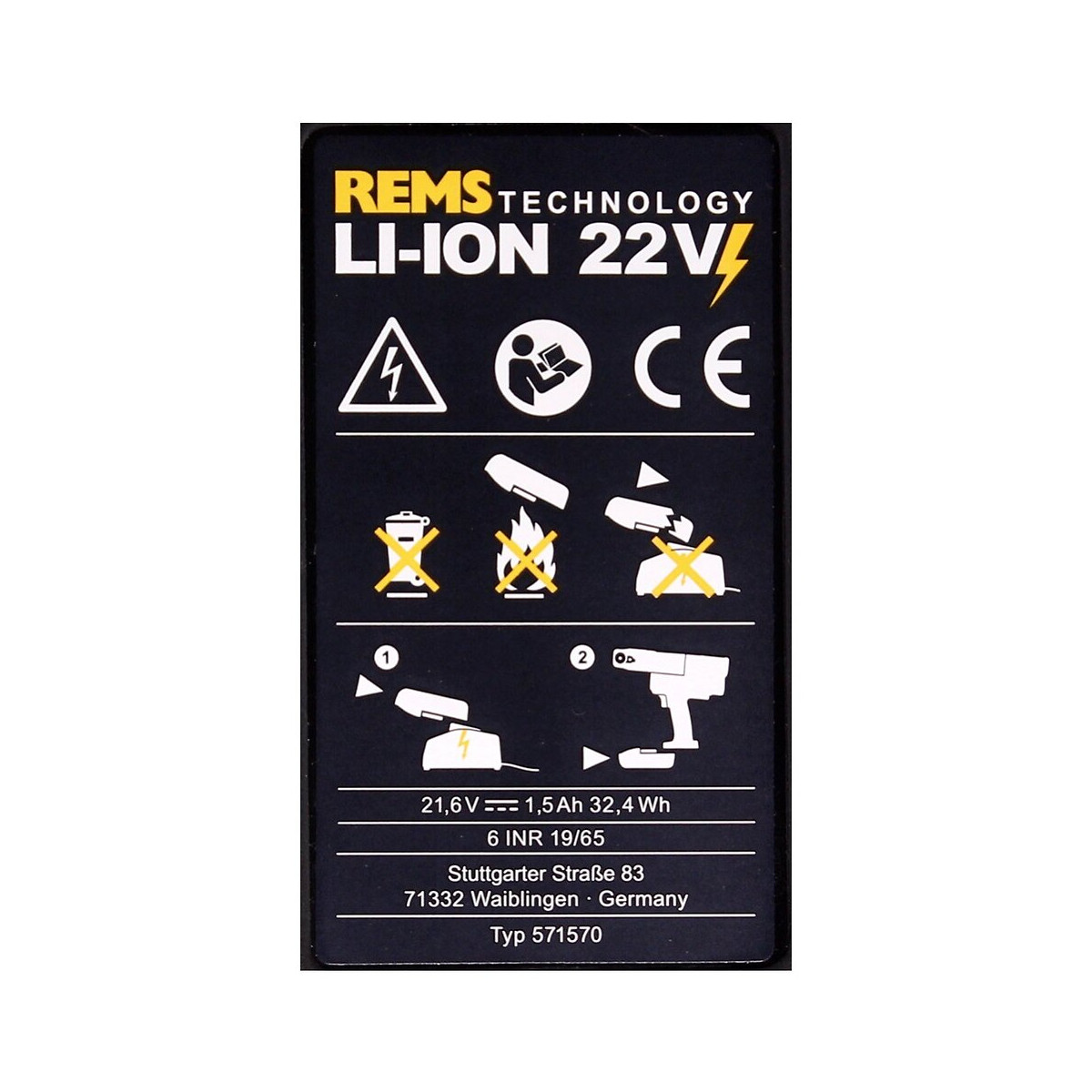 Contenu du paquet : - 2x Batteries REMS Li-Ion 21,6 V 1,5 Ah (571570 R22) Description du produit : Les batteries de la maison REMS sont légères, puissantes, résistantes et sont adaptées à tous les appareils REMS de 22 V. Les batteries de 21,6 V offrent 50 % de capacité en plus que les batteries Li-ion de 14,4 V. Avec le REMS Mini-Press S 22 V ACC, chacune de ces batteries peut générer environ 250 sertissages (Viega Profipress DN 15) par charge. A l'aide de 4 LED, l'indicateur gradué présente le niveau de charge des batteries. Après avoir appuyé sur le bouton portant le symbole de la batterie, au moins une LED s'allume pendant quelques secondes. Plus il y a de LED qui s'allument en vert, plus le niveau de charge de la batterie est élevé. Lorsque la LED clignote en rouge, la batterie doit être rechargée. L'absence de l'effet mémoire ainsi que la surveillance de la température lors du processus de charge assurent en permanence une performance optimale de la batterie. Spécifications techniques : Tension nominale : 230 V / 21,6 V. Tension de fin de charge : 22 V. Capacité de la batterie : 1,5 Ah. Puissance : 32,4 Wh Plage de température de fonctionnement : de -10 à 60 °C. Dimensions (L x l x h) : : 130 x 75 x 50 mm Poids : 450 g. Compatibilité des batteries et des produits : Produits Batterie 1,5 Ah Batterie 2,5 Ah Batterie 5,0Ah Batterie 9,0 Ah REMS Mini-Press 22 V ACC oui oui oui oui REMS Mini-Press S 22 V ACC oui oui oui oui REMS Akku-Press 22 V ACC oui oui oui oui REMS Ax-Press 25 22 V ACC oui oui oui oui REMS Ax-Press 25 L 22 V ACC oui oui oui oui REMS Ax-Press 30 22 V ACC oui oui oui oui REMS Akku-Ex-Press Cu 22 V ACC oui oui oui oui REMS Akku-Ex-Press P 22 V ACC oui oui oui oui REMS Akku-Ex-Press P-CEF 22 V ACC oui oui oui oui REMS Akku-Cat 22 V VE non non oui oui REMS Akku-Tiger 22 V VE non non non oui REMS Akku-Amigo 22 V non non non oui REMS Akku-Curvo 22 V non non oui oui REMS Akku-Cento 22 V non non oui oui