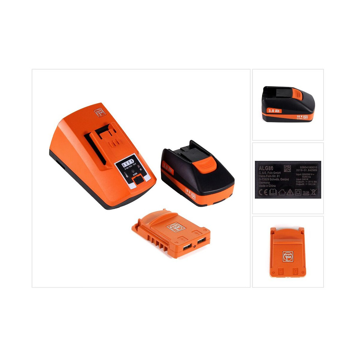 Contenu de la livraison: - 1x Batterie FEIN 18V 3.0 Ah Li-Ion - 1x Chargeur rapide FEIN ALG 80 18V - 1x Adaptateur de batterie USB FEIN AUSB 12-18V Description du produit: La batterie FEIN 18 V 3.0 Ah impressionne par sa compacité et ses performances. Les batteries Li-ion garantissent une durée de vie accrue et garantissent des temps de charge courts. La technologie SafetyCell de FEIN protège la batterie et la machine contre les surcharges, les surchauffes et les décharges profondes. La batterie de 3,0 Ah peut être utilisée sur tous les outils sans fil Fein 18 V. Avec le chargeur rapide ALG 80 de Fein, toutes les batteries Li-Ion Fein, quelle que soit leur capacité ou leur tension, peuvent être chargées. Le chargeur charge les batteries de 3 Ah à 80% de la capacité maximale en 26 minutes, même les batteries de 6 Ah sont chargées à 80% de la capacité maximale en 38 minutes. Grâce à l'affichage LED, il est facile de vérifier le niveau de charge. De plus, l'ALG 80 possède une interface USB avec laquelle un smartphone peut être chargé en parallèle. L'adaptateur USB pour batterie FEIN permet la charge à haute vitesse de 2 appareils (par exemple les smartphones). Avec la vitesse de charge de 1,2 ampère et les 2 ports USB, vous pouvez toujours recharger votre téléphone portable d'entreprise sur le chantier. Les batteries 12 volts, 14 volts et 18 volts peuvent être utilisées. Spécifications techniques: Batterie FEIN 18V 3.0 Ah Li-Ion Constructeur: 92604182020 Tension: 18 V Capacité: 3 Ah Type de cellule: lithium-ion Chargeur rapide FEIN ALG 80 18 V Constructeur: 92604180010 Tension de charge de la batterie: jusqu'à 18 V Courant de charge: 8 ampères interface USB Affichage LED Poids: 680 g Adaptateur de batterie USB FEIN AUSB 12-18V Constructeur: 92604201020 Convient pour: IOS et Android Compatible: 12 volts, 14 volts, 18 volts Ampères: 1,2 Nombre de connexions: 2 pièces