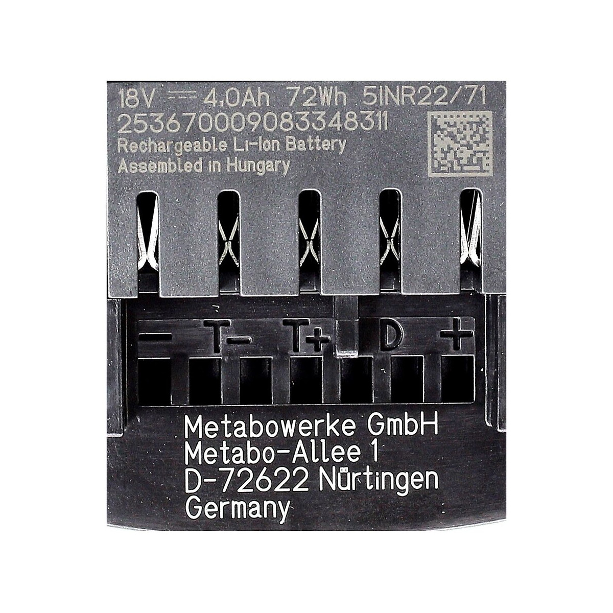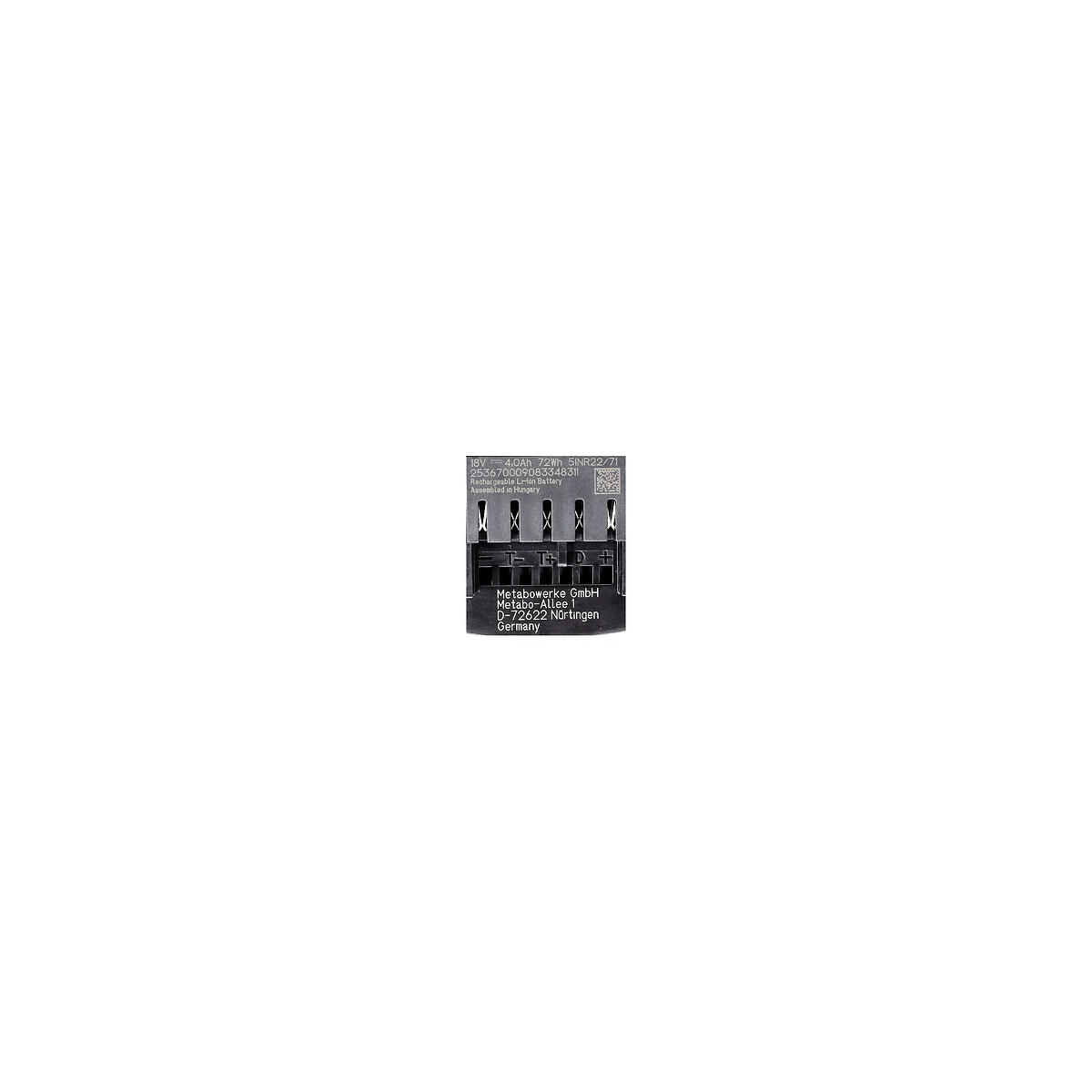 Batterie METABO 18V 4,0 Ah LiHD - Batterie LiHD pour une puissance ultime et une durée de fonctionnement maximale avec un dégagement minimal de chaleur - Technologie Ultra-M : une gestion intelligente des batteries pour des batteries durables, garanties 3 ans - Technologie de chargement brevetée "AIR COOLED" - Surveillance électronique individuelle des cellules (ESCP) permanente lors du chargement, pour une durée de vie particulièrement longue - Gestion de chargement et de déchargement contrôlée électroniquement - Indicateur de capacité pour un contrôle permanent du niveau de charge - Possibilité de stockage prolongé n'occasionnant pratiquement aucune décharge - 100 % de compatibilité avec toutes les machines 18 V et les chargeurs du système CAS