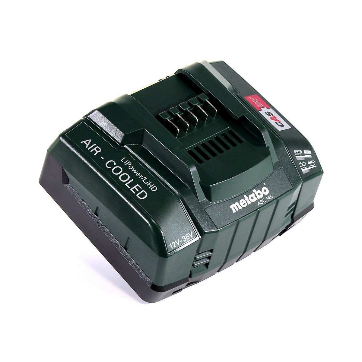 Chargeur METABO ASC145 - Pour la recharge de toutes les batteries à logement coulissant Li-Ion et LiHD (12 V - 36 V) avec un courant de recharge de batterie adapté - Technologie de recharge << AIR COOLED >> brevetée : refroidissement de la batterie lors de la recharge pour une recharge nettement plus rapide - Très faible puissance absorbée en veille - Gestion de la recharge commandée par processeur pour une recharge qui préserve la batterie et un nombre maximal de cycles de recharge - Compatible avec toutes les batteries du système CAS