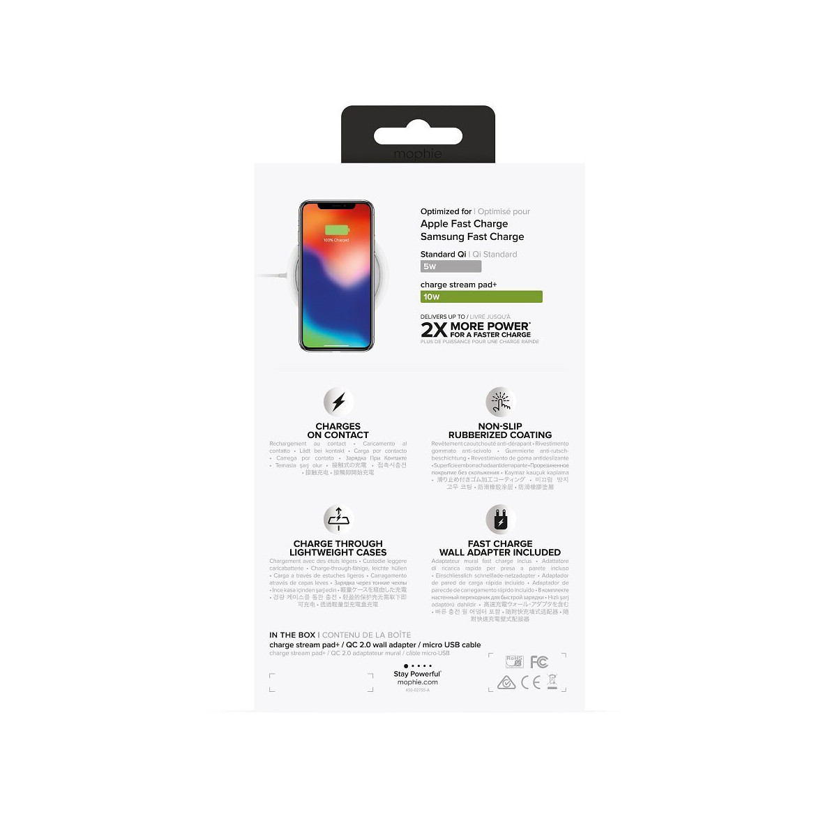 Station de charge universelle avec fonctionnalité Fast Charge Apple et Samsung. Optimisée pour Apple, Samsung et autres smartphones dotés de la technologie Qi. Charge sans files smartphones Apple, Samsung, Motorola, LG, les autres smartphones dotés de la technologie Qi et les étuis mophie avec chargement sans fil. - Le design minimaliste et discret s’intègre à tous les environnements, que vous rechargiez votre téléphone chez vous ou au bureau. - La partie supérieure caoutchoutée offre une prise antidérapante et une protection contre les rayures, garantissant que le téléphone reste en place pour maintenir une connexion continue pendant le chargement. - La structure interne en métal moulé crée une plateforme stable et solide qui ne bouge pas : posez puis chargez. - Puissance : 12 V, Entrée 1,5 A / 5 W (Universel), 7,5 W (Apple), 10 W (adaptateur Samsung pour charge rapide) - Compatibilité : étuis mophie avec alimentation sans l'iPhone 8, iPhone 8 Plus, iPhone X, Samsung Galaxy Note8, Samsung Galaxy S8, Samsung Galaxy S8+, Samsung Galaxy S7, & Samsung Galaxy S7 edge Motorola, LG et autres smartphones dotés de la technologie Qi - Dimensions : 0,46 x 3,82 x 3,82" (12 x 97 x 97 mm) - Poids : 136 g (4,8 onces)