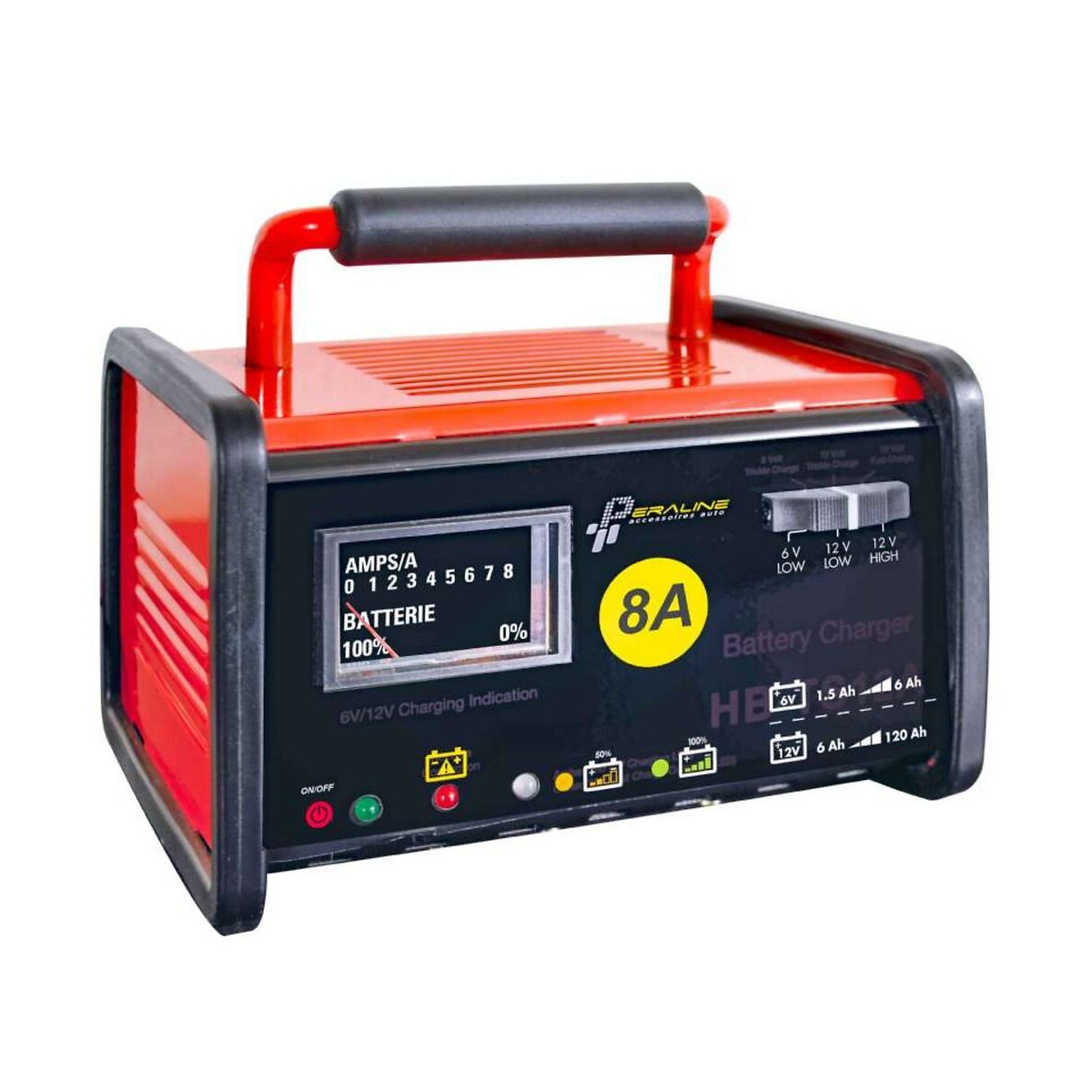 Avec ce chargeur de batterie portable, vous êtes paré pour charger les batteries scellées GEL, SLA ou sans maintenance, motos et voitures 6 à 12 V. Ce chargeur convient pour les batteries au plomb, avec électrolyte liquide constitué d’une solution d’eau et d’acide sulfurique, ce type de batterie est le plus répandu dans le secteur automobile. Caractéristiques techniques: Intensité 8 Ah à 6v et 120 Ah à 12v Fonctionne en 230 V Tension de charge et démarrage 6 et 12 V Ampèremètre Dimensions 140 x 190 x 165 mm