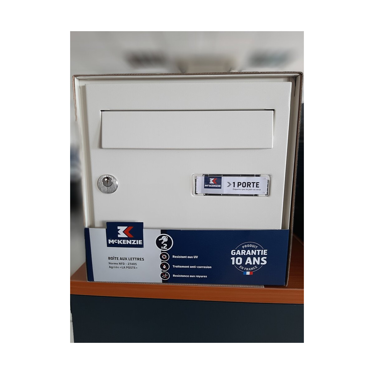 Boîte aux lettres Mc Kenzie, 1 ou 2 portes: Corps et volet en acier revêtu peinture 100% polyester structuré Ouverture à la française Fenêtre d’introduction du courrier (235x30 mm) avec volet en levant Porte avant équipée d’un barillet PTT livré avec 2 clés Finition aspect givré Coloris : Blanc, ton pierre 1013, vert, gris 7016, noir Fixation en applique (avec un support adapté), sur piquet ou encastré (avec un cadre d’encastrement) Dimensions L 302 x H 300 X P 410 mm Garantie 10 ans Conforme à la norme NF-D-27405 Existe en versions 1 et 2 portesSpécifications techniques