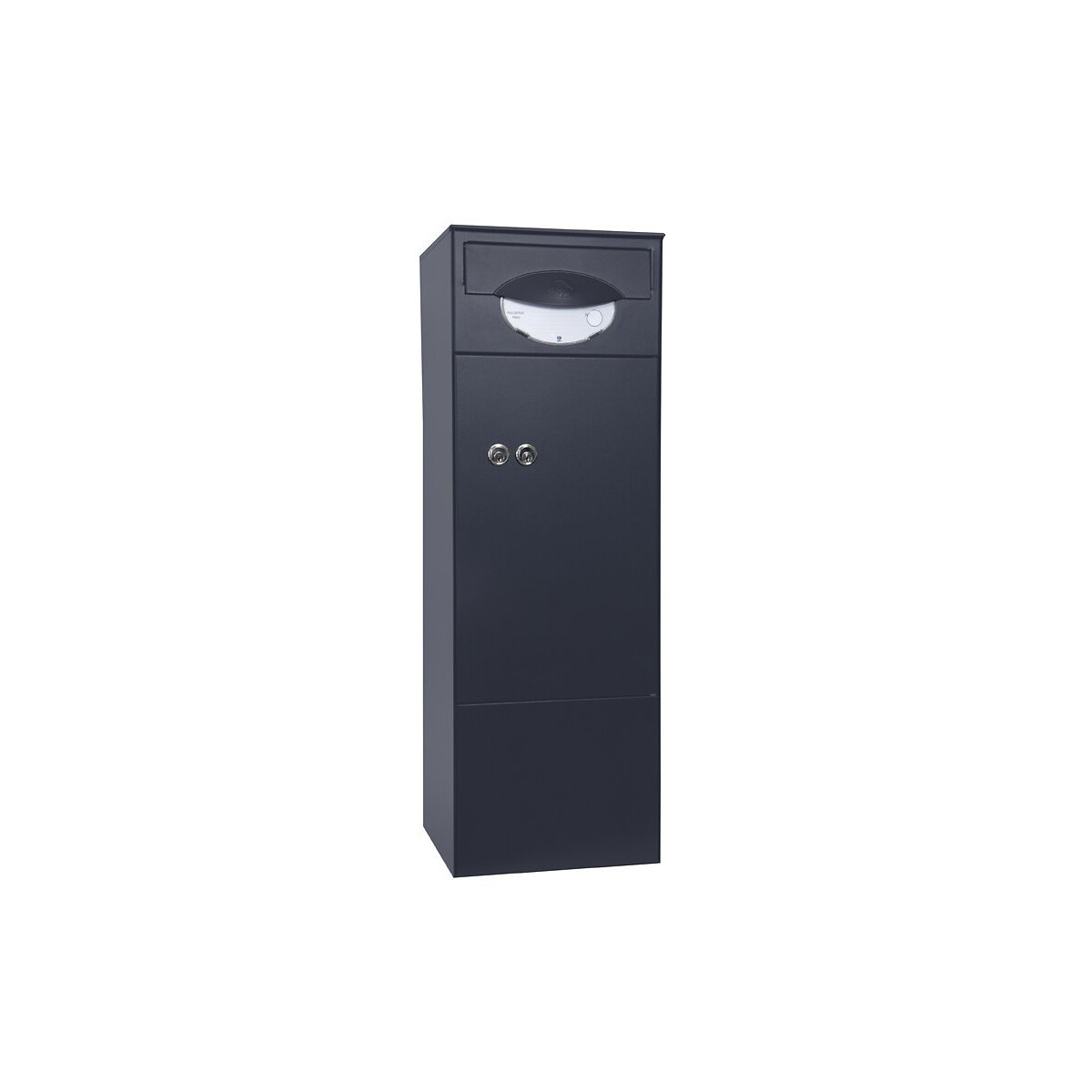 Boîte à colis @ Box 950 en tôle d'acier électrozingué Caractéristiques : - Fenêtre d'introduction du courrier (280x35 mm) avec chicane anti-vol et volet en levant - Forme du volet ergonomique pour une prise en main facilitée - Porte-nom XXL (170 x 80 mm) protégé par le volet pour une étanchéité garantie - Fermeture par serrure colislock - Charnière invisible en inox - Aménagement intérieur : 1 tablette amovible - Socle hauteur 25 mm - Toît avec rejet d'eau - Pose au sol - Kit de scellement intégré - Coloris gris ral 7016 - Fabrication française