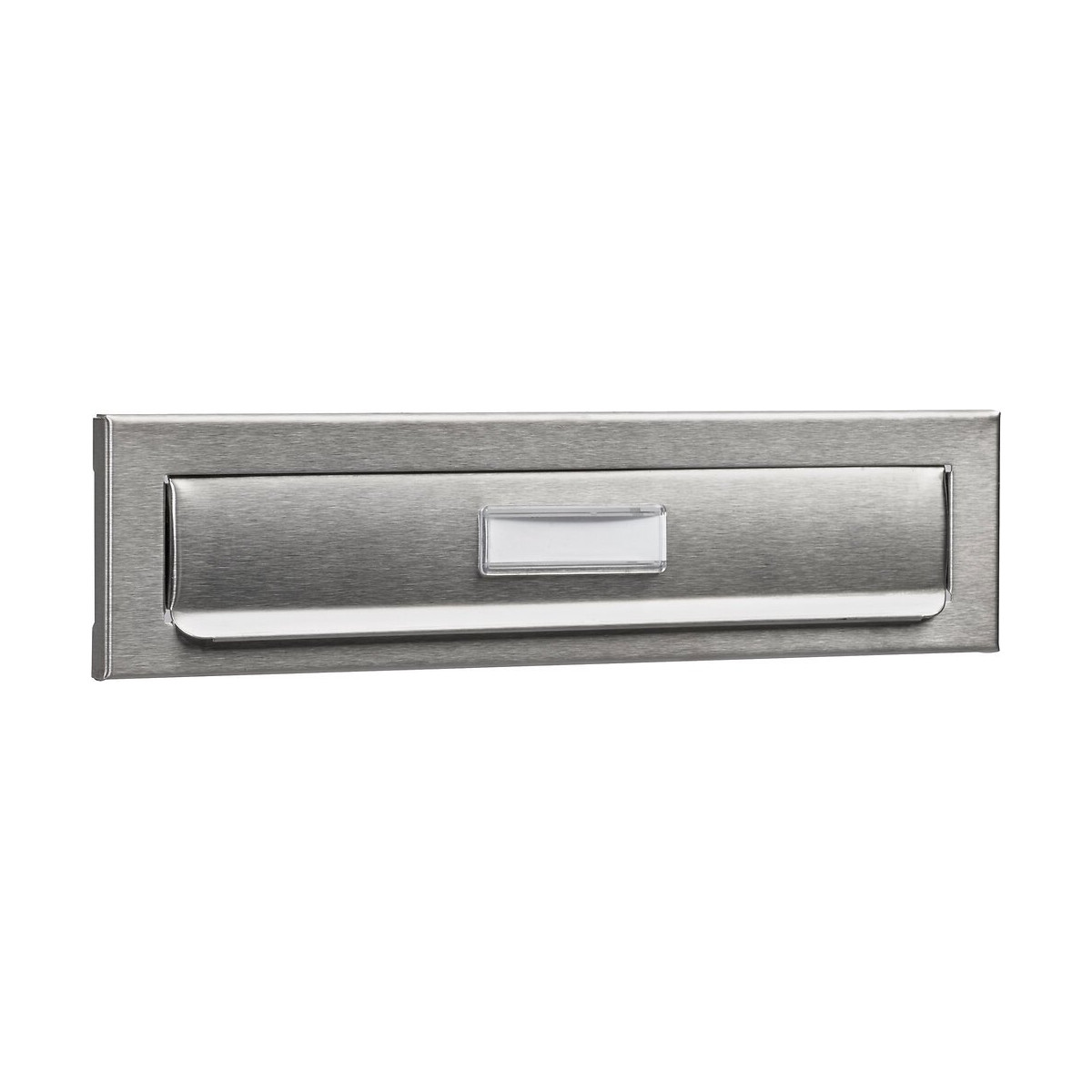 Entrée de courrier inox. Entièrement en acier inoxydable. Volet cache-entrée à lever. Porte-nom en plexiglas 60x15mm. Livrée avec vis de fixation. Dimensions L265xH67xP8mm. Passage courrier 230x30mmSpécifications techniques