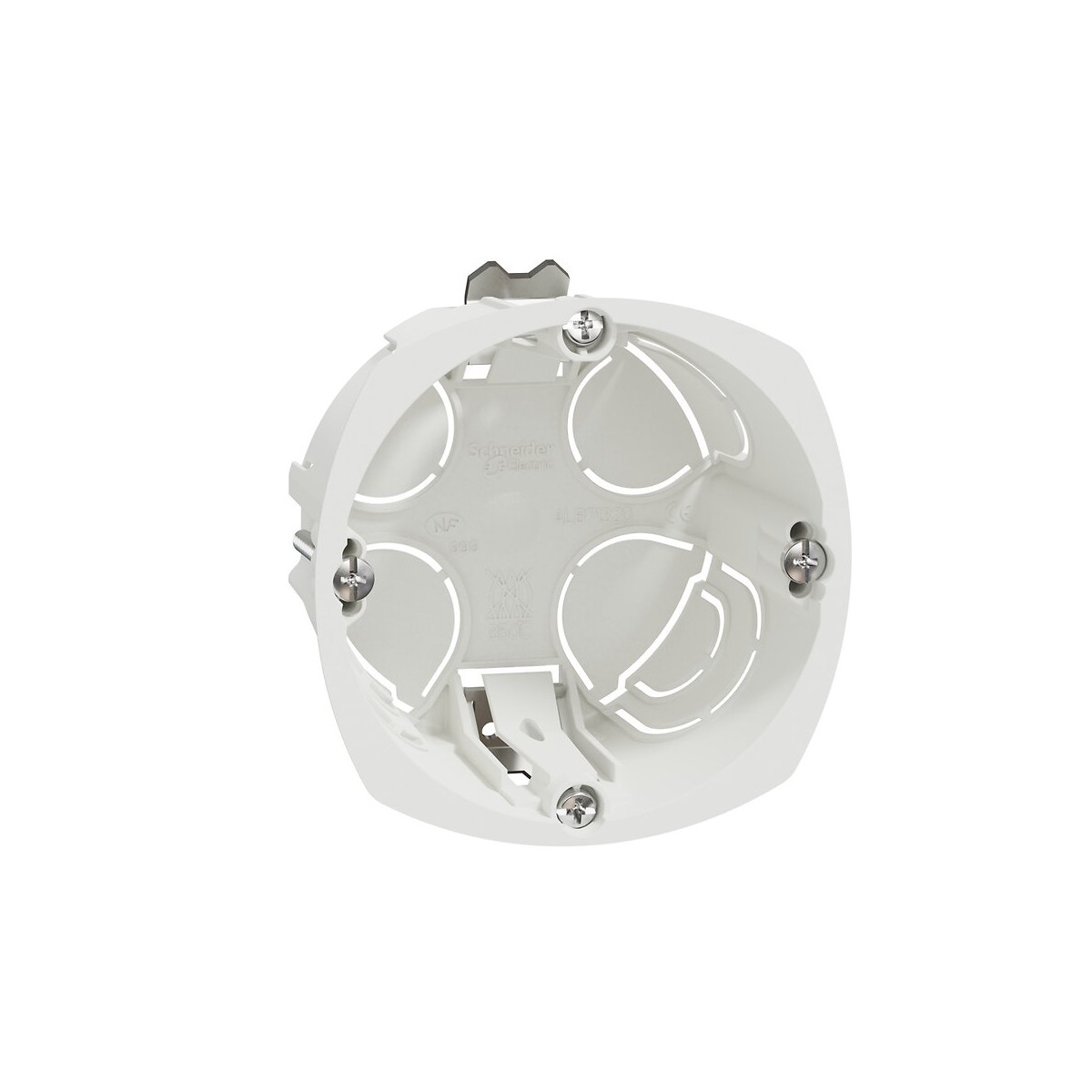 BOÎTE D'ENCASTREMENT 1 POSTE MULTIFIX SCHNEIDER Cette boîte d'encastrement Multifix, de la marque Schneider Electric, est un support de montage servant à la fixation des mécanismes électriques. Elle est essentiellement utilisée dans les installations encastrées pour assurer le montage des appareillages tels que les prises de courant, les interrupteurs et les boutons poussoirs. Ce support est adapté à tous les mécanismes monopostes d'un diamètre allant jusqu'à 67 mm. Cette boîte d'encastrement est aussi compatible avec tous les systèmes de fixation de mécanisme à vis ou par griffes. L'admission des câbles et des gaines se fait aussi facilement par 4 entrées défonçables d'une dimension de 16 et de 20 mm.Spécifications techniques