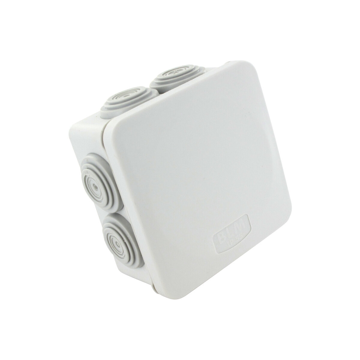 Boite de dérivation étanche 960°C BLM. Format : 80x80 mm et 35 mm de profondeur. Avec couvercle d'isolation. 7 Entrées isolantes. Coloris gris. Matière plastique. IP55.