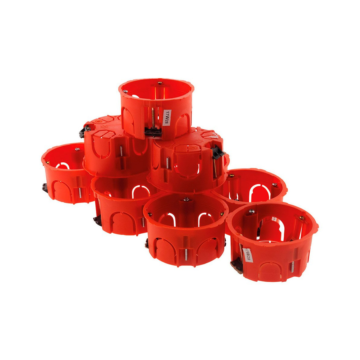 Lot de 10 boites d'encastrement pour cloison sèche (placo). Pour appareillages à vis ou à griffes (en monopose). A encastrer dans les murs en plaque de plâtre. Fixation par vissage des pâtes latérales sur l'épaisseur du plâtre de la cloison (vis fournis). Dimensions: Ø65mm et profondeur 40mm. Diamètre de perçage 67mm. Haute résistance au feu 850°.