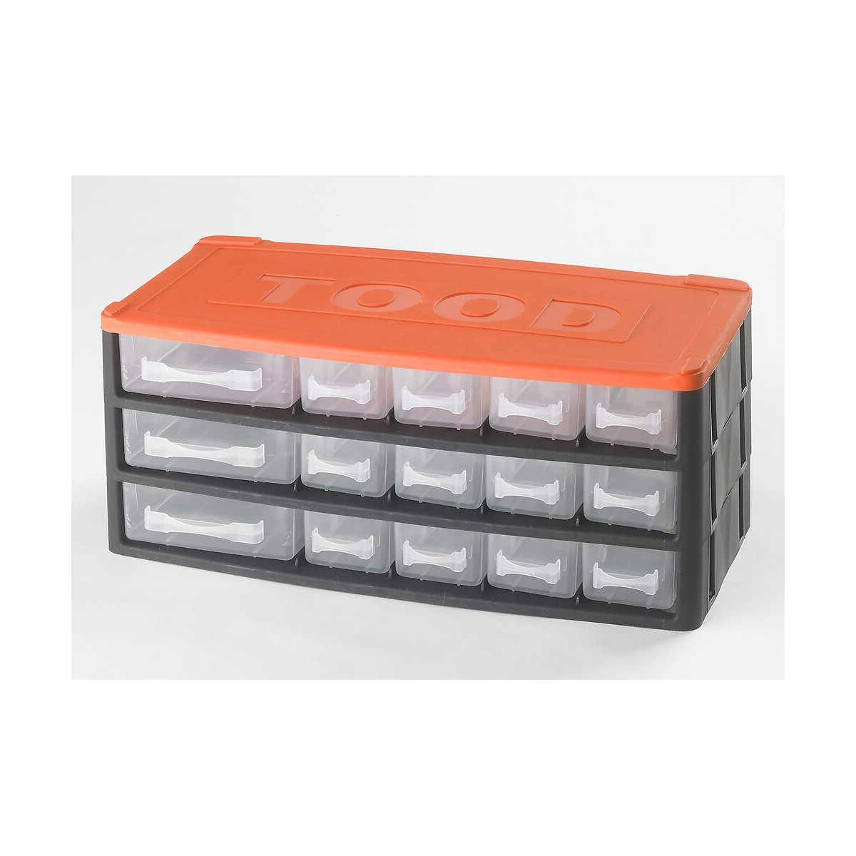 Casier à vis plastique avec 15 tiroirs transparents soit 3 moyens, 12 petits. Dimensions : 33x17x14 mm