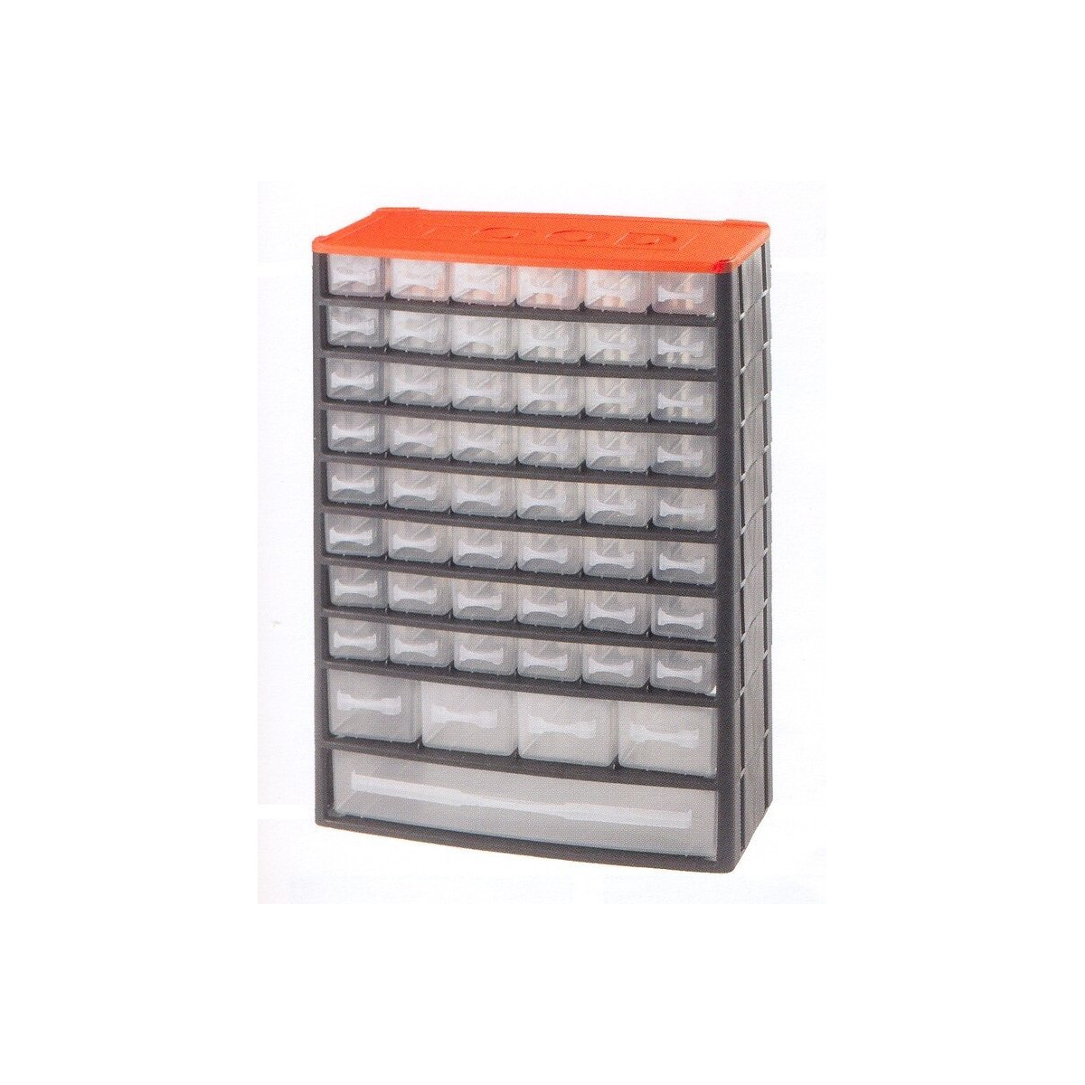 Casier à vis plastique avec 53 tiroirs transparents soit 1 grand, 4 moyens, 48 petits. Dimensions : 33x17x48mm