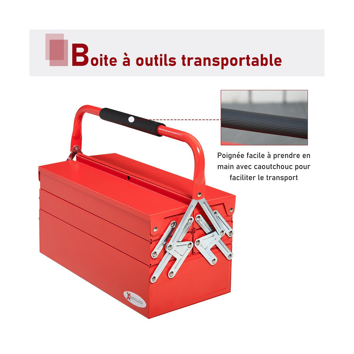 Cette boite à outils à main vous permettra de ranger, ordonner et transporter facilement vos outils et visserie. Caractéristiques : - Boite à outils avec corps en tôle d'acier compact et robuste de qualité professionnelle - 3 niveaux offrent un grand espace de rangement pour vos outils, votre visserie ou autres accessoires - 5 plateaux rétractables afin de vous faciliter l'accès à vos outils - Une poignée de transport avec revêtement EVA antidérapant pour un déplacement facile, pratique - Convient pour un usage domestique ou professionnel (garage, usine, entrepôt, etc...) - Revêtement peinture époxy anticorrosion - Note : aucun outil n'est fourni en plus de la boite à outils Spécifications : - Couleur : rouge - Matériau principal : tôle d'acier (SPCC) - Dim. totales : 45L x 22,5l x 34,5H cm - Dim. dépliées : 69L x 45l x 23H cm - Dim. petit plateau : 41,5L x 9,5l x 5H cm - Dim. grand plateau : 41,5L x 20l x 10H cm - Dimensions couvercle : 41L x 10l cm - Charge max. recommandée : 20 Kg - Livraison effectué en un colis - Réf. : B20-079RD