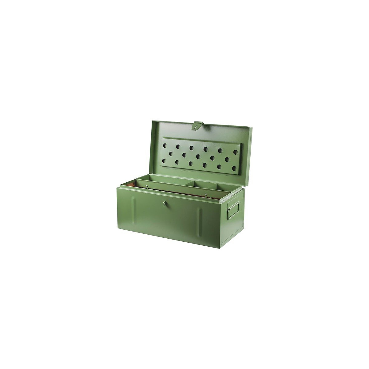 Conception Robuste En Tôle D'acier Avec Couvercle Renforcé. Couvercle De Protection Contre Les Projections D'eau Intérieur Revêtu Et Peint Garniture Rivetée Couvercle Avec Compartiment Pour Dessins Poignées De Transport Solides Insert Pour Petits Composants Et Supports Pour Niveau à Bulle Fermeture Possible à L'aide D'un Cadenas
