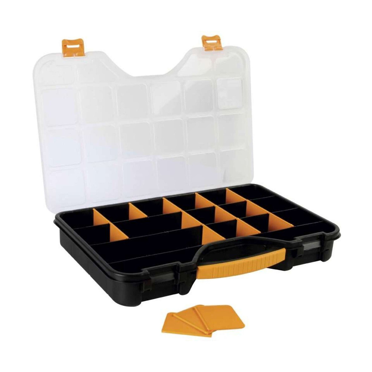 Une caisse de transport pour votre visserie.Boîte de rangement à 18 compartiments modulables offrant un rangement particulièrement rationnel pour toutes les petites pièces vis, écrous, chevilles, joints, etc....