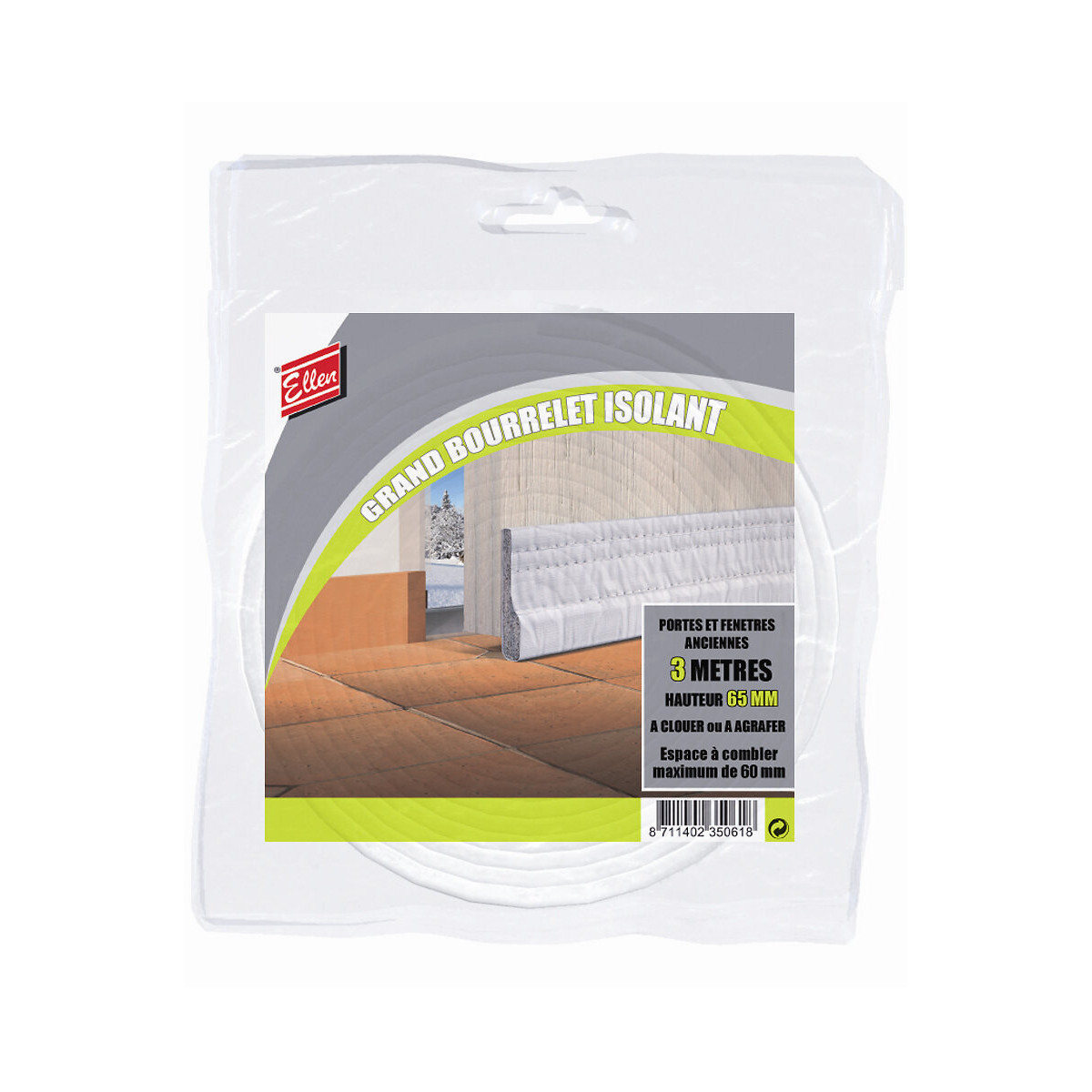 Bourrelet gainé de PVC lavable, à clouer ou à agrafer pour porte et fenêtre - Espace à combler jusqu'à 65 mm - Longueur : 3 m - Coloris : Blanc