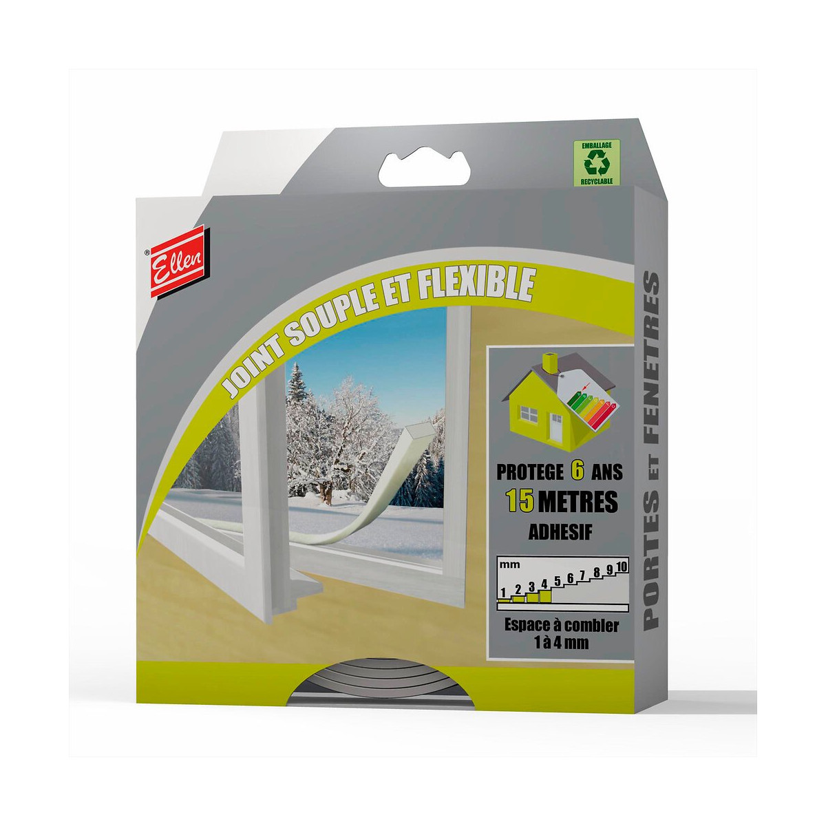 Joint de rénovation adhésif en mousse de PVC souple et flexible pour l'encadrement de portes et fenêtres - Forme : Rectangulaire - Espace à combler : 1 à 4 mm - Longueur : 15 m - Coloris : Blanc.