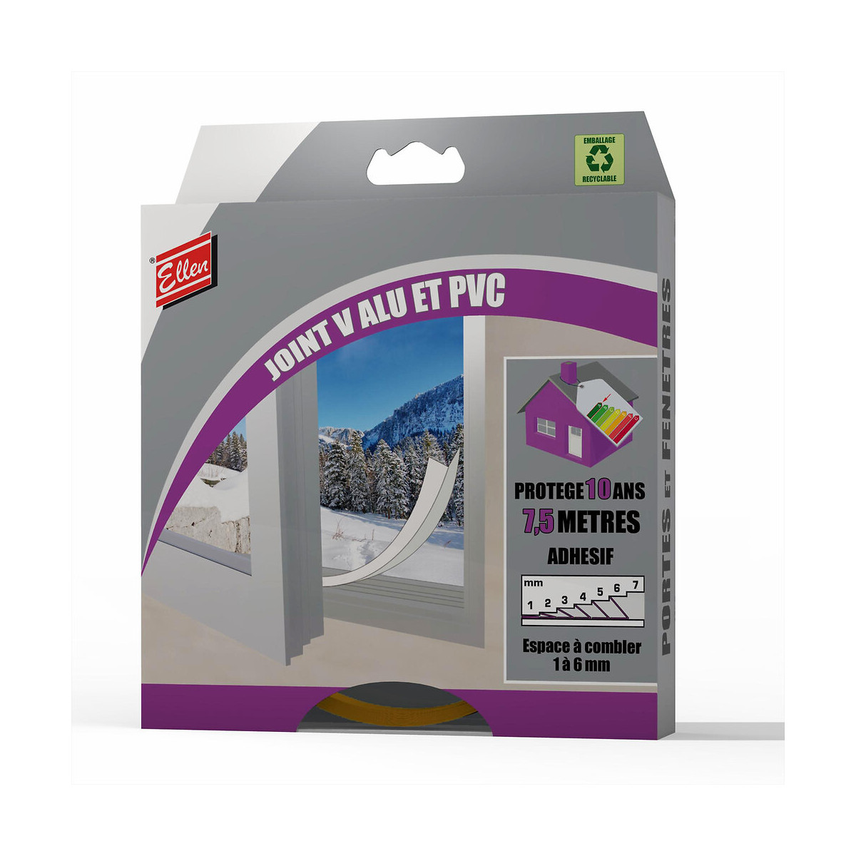 Joint de rénovation adhésif en polypropylène souple forme V, pour l'isolation des portes et fenêtres alu et PVC - Espace à combler : 1 à 6 mm - Longueur : 7,5 m - Coloris : Transparent