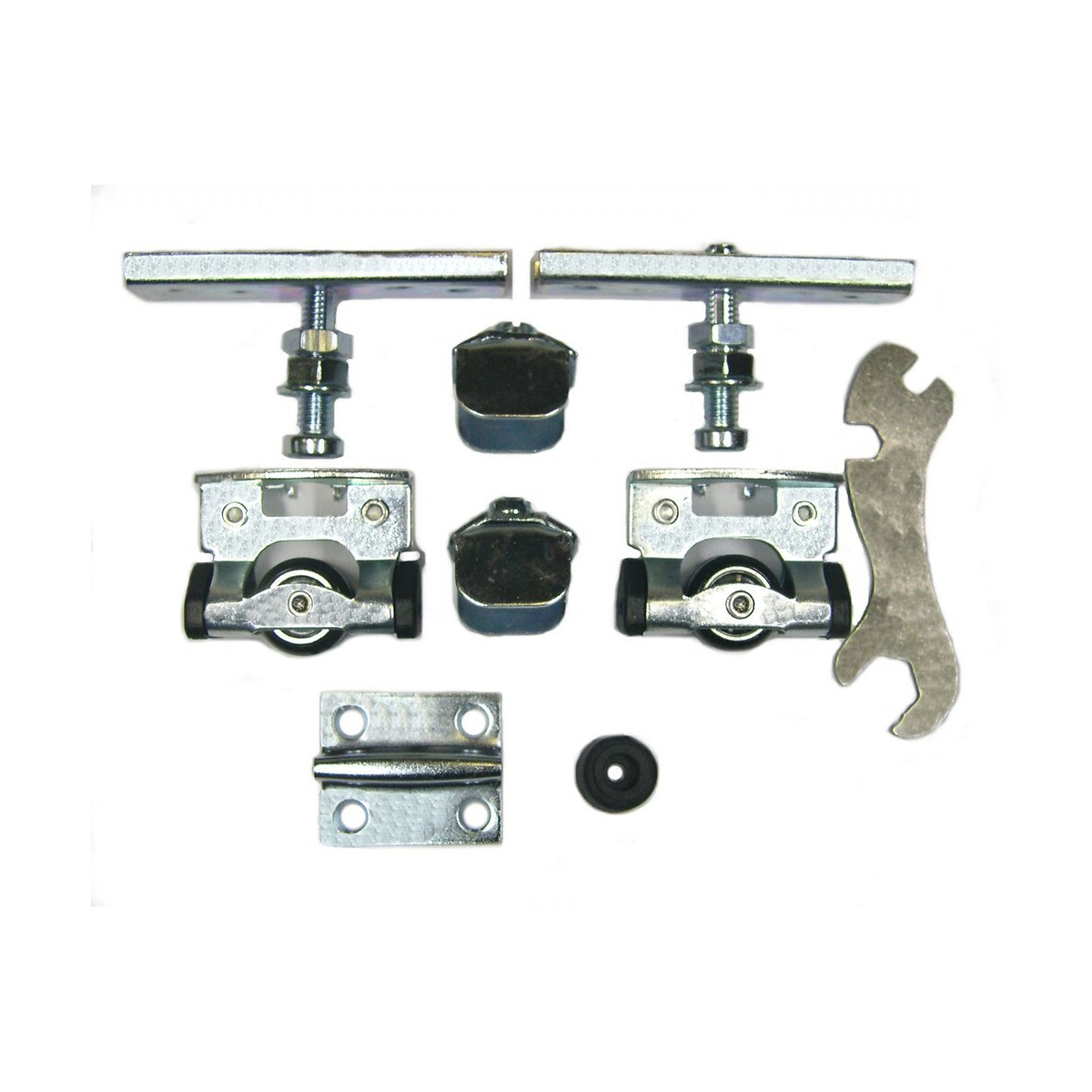 Boîte avec accessoires pour rail SP 40 composée de : - 2 platines, dimensions : Longueur 78 mm x Largeur 20 mm, et vis de réglage - 2 galets, dimensions : Hauteur 32 mm x Largeur 43 mm x Profondeur 20 mm - 2 butées avec frein, dimensions : Hauteur 22 mm x Largeur 21 mm x Profondeur 18 mm - 1 curseur, dimensions : Hauteur 15 mm x Largeur 35 mm x Profondeur 30 mm.