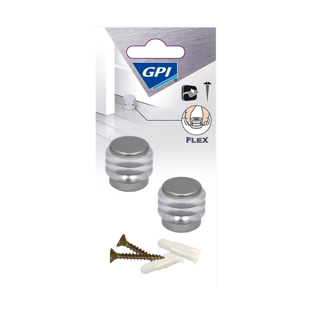 Butée plastique avec anneaux amortisseurs. Pour protéger le mur et la poignée. Fixation au sol adhésif ou à visser.Spécifications techniques
