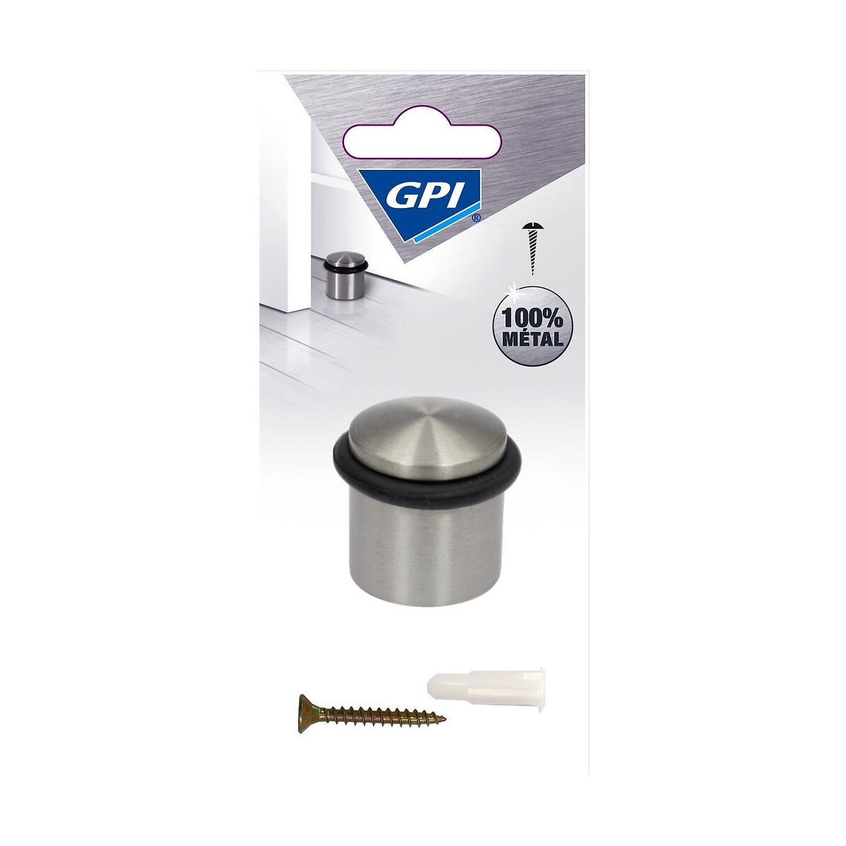Butée métal avec anneau amortisseur D32. Pour protéger le mur et la poignée. Fixation au sol à visser.Spécifications techniques