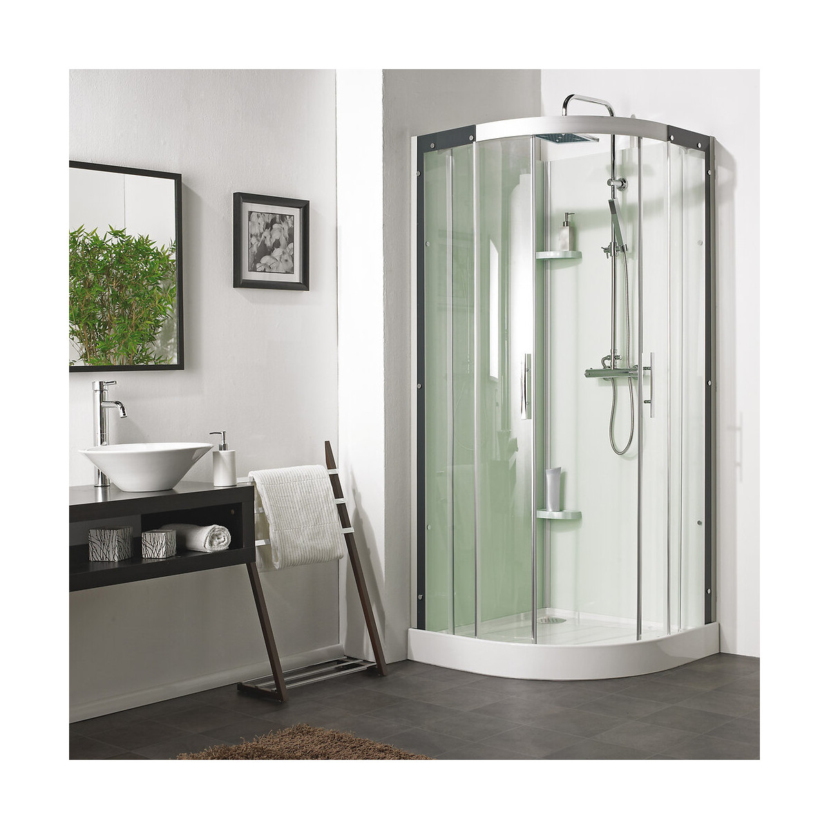 La cabine de douche Flotille est de forme 1/4 de cercle 90x90cm, sa porte coulissante permet un véritable gain de place. Le mitigeur est doté d'un système d'économie d'eau. Le système anti-brûlures intégré au mitigeur thermostatique protège les enfants des accidents. Son montage sans joint silicone rend la pose plus simple et plus rapide. La douche est composée de : Mitigeur thermostatique barreau avec douchette à main large douche pluie pour un effet relaxant 2 étagères porte-flacon Option hydromassage : mitigeur thermostatique encastré avec 6 buses à roto-jet pour un effet pulsé Caractéristiques techniques : Sécurité enfants avec système anti-brûlures intégré au mitigeur thermostatique Avec panneaux de fond en verre opaque de 6 mm Porte coulissante en verre de sécurité 6 mm Dimensions : Longueur 90 cm largeur 90 cm Hauteur 221 cm Dimensions intérieures : Longueur 90 cm largeur 90 cm Hauteur 201 cm Poids : 110 kg