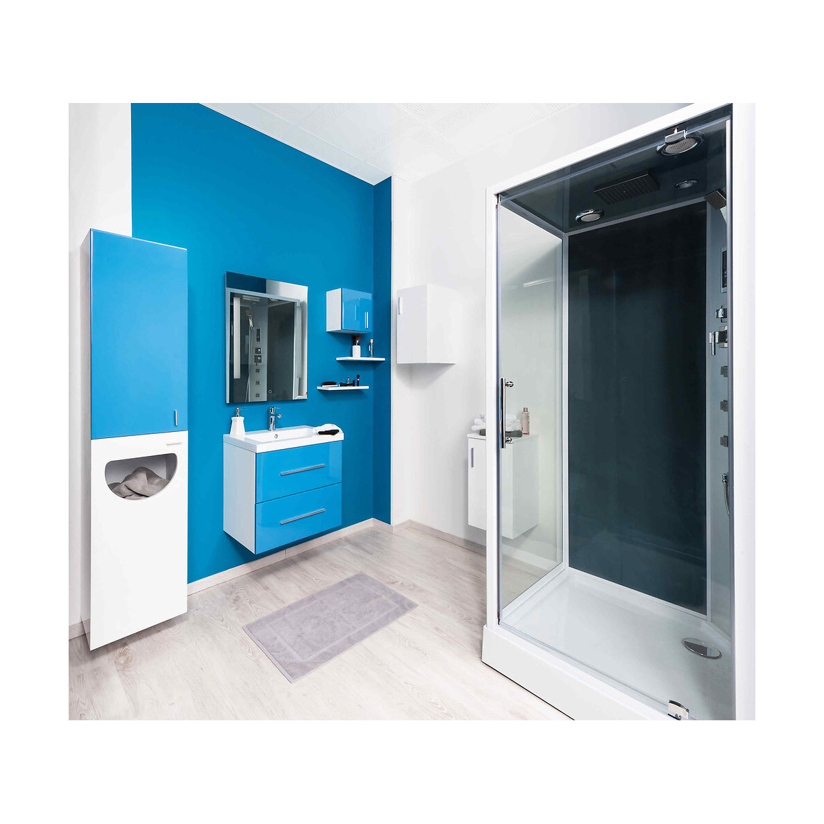 La cabine de douche hydromassante Niky est équipé de la radio. Caractéristiques : Colonne en PVC peint gris mat et 2 parties latérales en verre miroir gris 5mm Mitigeur mécanique / inverseur de fonctions 3 buses massantes Douchette à main sur patère avec flexible Radio Receveur, hauteur 15cm, en ABS blanc renforcé de résine avec fibre de verre sur châssis métallique, livré avec bonde Accès de face à ouverture réversible verre transparent de 5mm Panneau fixe et porte pivotante, avec profils en aluminium peint blanc Poignée en inox chromé Largeur de passage : 56cm Toit en verre gris de 5mm avec douchette haute carrée, spot et ventilateur Hauteur sous douchette haute = 195cm Dimensions : Longuuer 90 cm Largeur 90 cm Hauteur 215 cm Poids : 99 kg