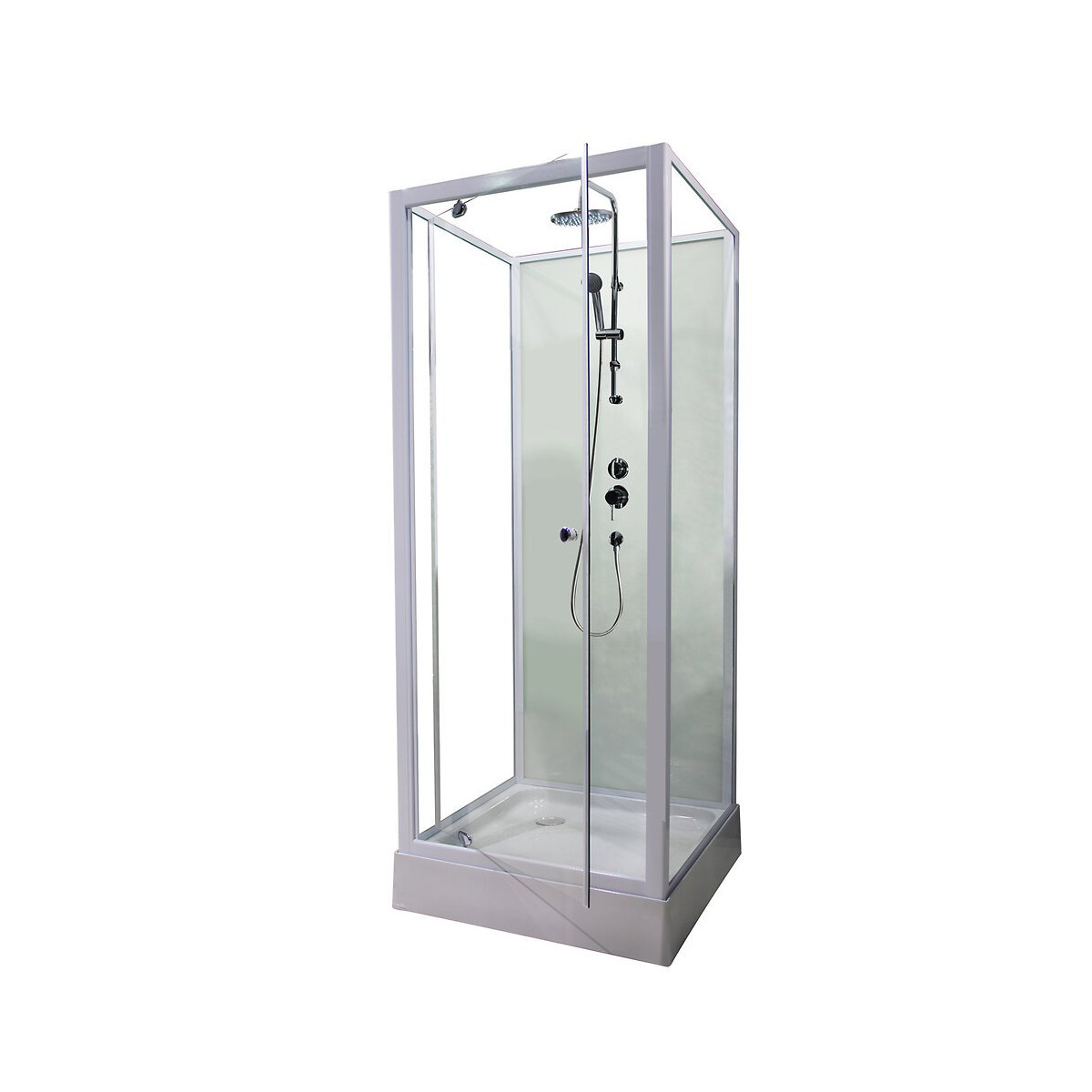Caractéristiques : - Taille totale : 80 x 80 x 220cm - Cadre : aluminium peint en blanc - Panneau arrière : verre trempé de 4 mm peint en blanc - Panneau fixe : verre trempé transparent de 4 mm - Porte pivotante : verre trempé transparent