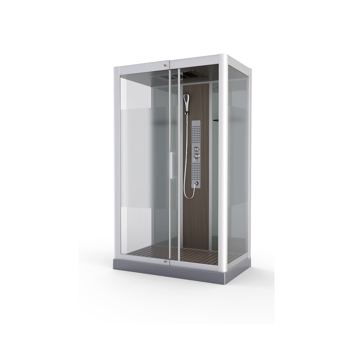 La cabine de douche rectangle est dôté d'une porte coulissante réversible en verre. Caractéristiques : Structure en aluminium laqué gris métal Porte coulissante réversible en verre Porte et côtés en verre avec bande dépolie Colonne en bois composite avec plaque inox Toit et receveur en acrylique gris renforcé Fermeture magnétique avec poignée en inox chromé Dimensions : Longueur 115 cm Largeur 90 cm Hauteur 215 cm