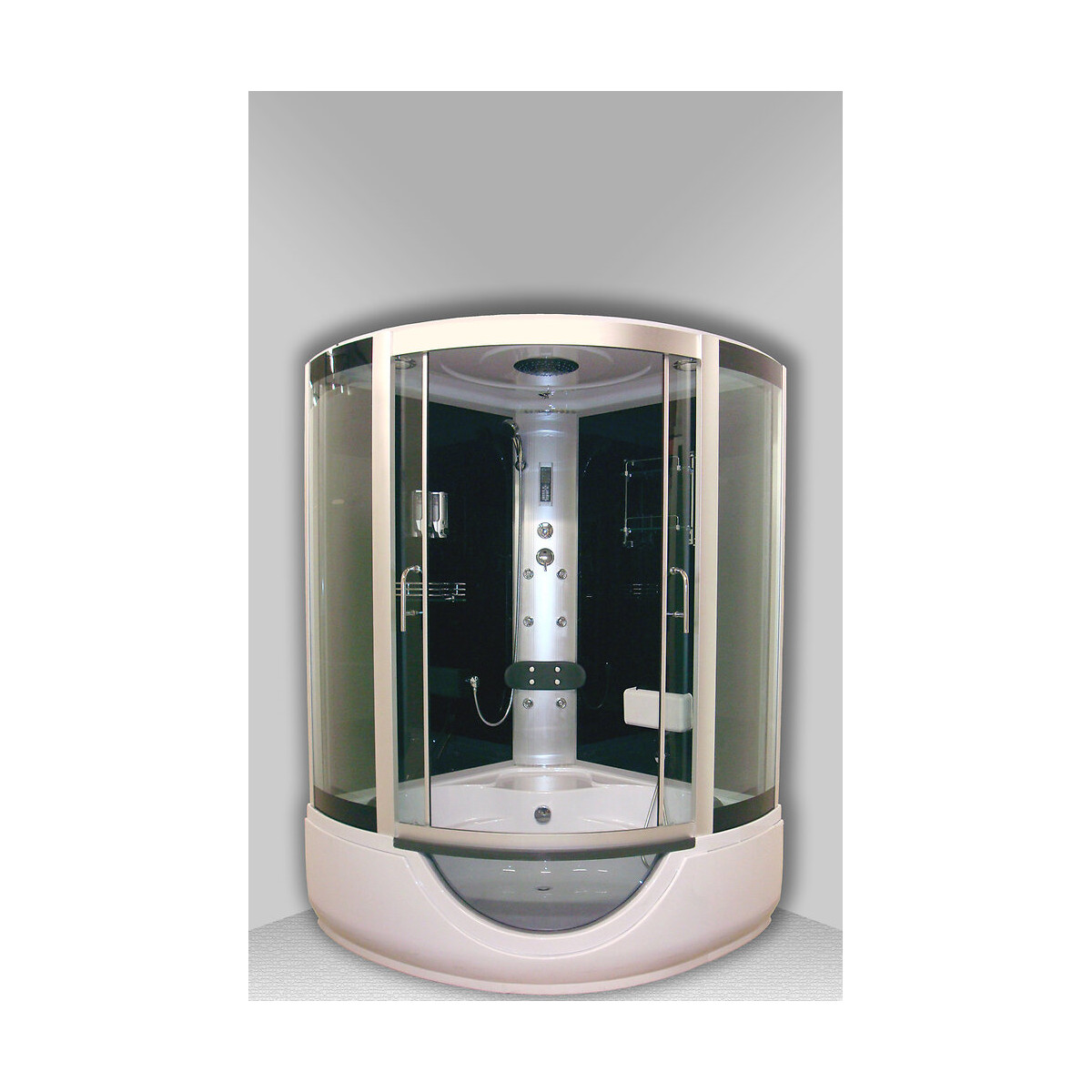 La cabine de douche et bain hydromassante Faro 136x136cm est équipée de deux parois fixes, deux poignées inox, une fermeture magnétique et des profilés de finition aluminium peint gris.Caractéristiques :Fond en verre coloris perle noirEtagères de rangement et fonction pédiluveUne étagère de rangement, deux distributeurs de savon et bec de remplissage pour baignoireUne colonne d?angle en PVC peint gris avec mitigeur, une douchette, 6 jets massants, un dossier avec 4 buses de massage, radio FM avec module de commandeToit en ABS blanc recevant une douche de tête Ø 200 mm, haut-parleur, aérateur et un spotBaignoire H. 520 mm en acrylique blanc sur châssis métallique avec pieds réglables, livré avec bonde Ø 60mm, hublot en plexiglas, siége préformé et deux appuis têteDimensions : Longueur 136 cm Largeur 136 cm Hauteur 230 cmPoids : 199 kgSpécifications techniques
