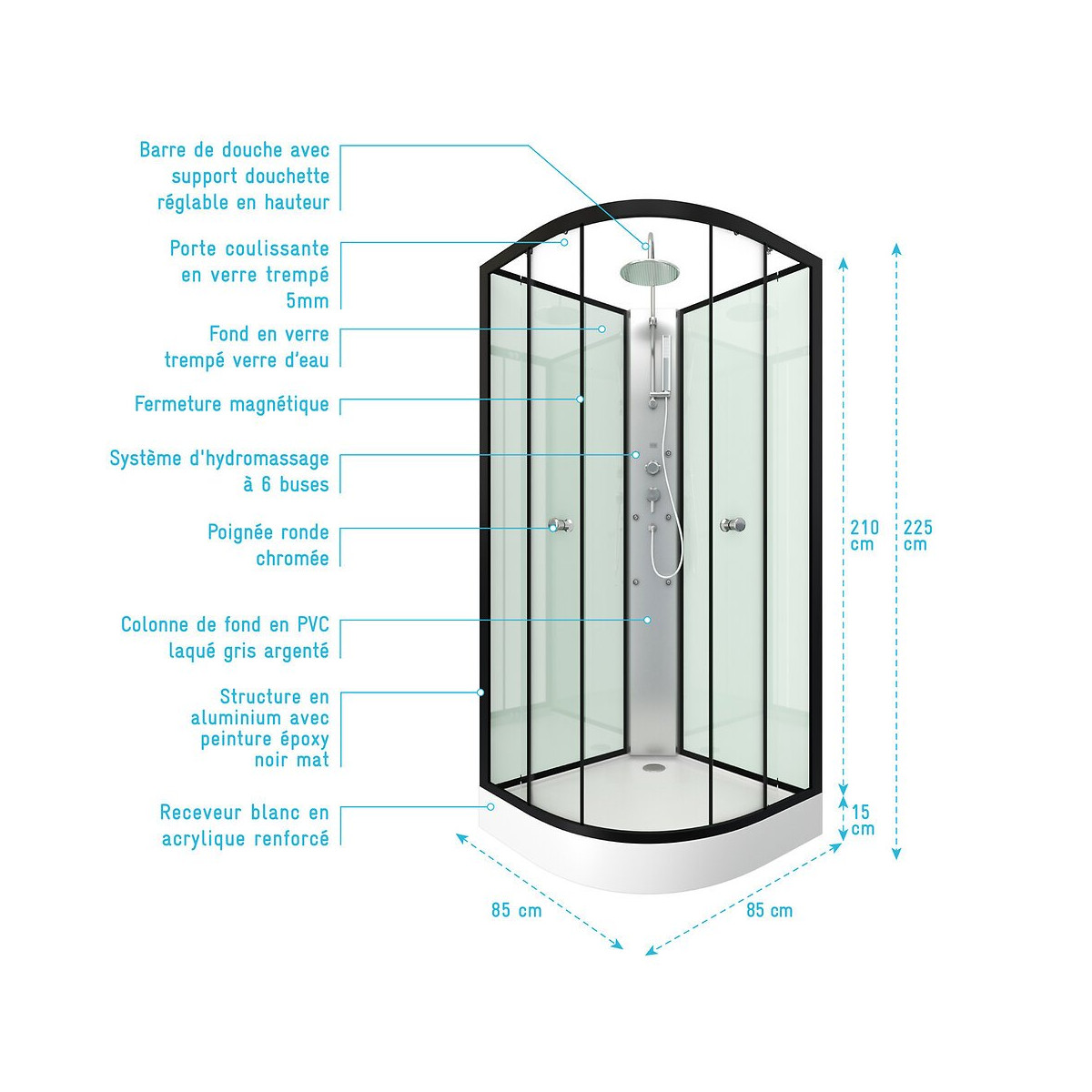 Caractéristiques techniques Dimensions extérieures 85x85x225cm Pose en angle uniquement Structure en aluminium laqué noir Portes coulissantes en verre trempé 5 mm Fonds en verre trempé blanc Colonne de fond en PVC laqué gris argenté Receveur blanc en acrylique renforcé Fermeture magnétique Montage sans silicone Attestation de conformité sanitaire Équipement Barre de douche avec support douchette réglable en hauteur Douche de tête pluie Douchette à main rectangulaire Poignées rondes Mitigeur mécanique System d'hydromassage à 6 buses Bonde 60mm et tuyau de raccordement en 40mm Livré avec flexibles d'arrivée d'eau Référence: CAB87B Garantie 2 ans pièces et non main d'oeuvre. Profilé noir mat thermolaqué : Le thermolaquage est une technique de traitement spécifique réservé aux matériaux en métal ou en aluminium brut. On projette de la peinture en poudre chargée en électricité statique qui va se déposer sur toute la surface des profilés. Cette technique de pulvérisation en poudre , qui s’appelle projection électrostatique ou poudrage électrostatique, permet d'avoir un revêtement complètement uniforme sur tous les profilés. Ce type de traitement dispense l’utilisation de produits chimiques nocifs pour la santé et l’environnement comme les solvants. Après avoir été recouverte de poudre, la pièce doit passer dans un four où elle sera chauffée pendant 20 minutes à 200°C. Les avantages du thermolaquage : Cette technique possède de nombreux avantage, qui sont La surface peinte possède une dureté supérieure ce qui a pour conséquence une résistance aux chocs accrue Le thermolaquage a une meilleure résistance à la corrosion La couleur des profilés thermolaqués résiste mieux au vieillisement et tout autres élément tel que l'humidité etc. Les profilés thermolaqués présentent une meilleure finition, fini les coulures de peinture et défauts d'aspect, avec cette technique la surface est uniforme Sans solvant c'est un véritable plus pour la santé Mais aussi plus écologique (pas de solvants) Dans un souci de qualité mais aussi de sécurité nos produits répondent à toutes les normes Européennes en vigeur. Que ce soit en terme de sécurité en cas de casse, d'entretien de nos produits ou de la durée de vie de ces derniers, nos produits remplissent tous les critères. Verre trempé : Le verre trempé est un verre qui a subi un traitement afin d’améliorer ses propriétés. Nous utilisons la trempe thermique qui consiste à porter le verre à très haute température (environ à 700 °C), puis de le refroidir rapidement. Ce processus favorise l'apparition de tensions en profondeur et celle de la compression à la surface du verre. Tout cela a pour effet l’amélioration de sa résistance aux chocs. Il est de 2 à 5 fois plus résistant que le verre simple. Mais aussi diminue grandement la dangerosité du verre car en cas de casse le verre explose en de petits morceaux et non pas en de grands pans tranchants. Pour le reste il conserve les mêmes propriétés que le verre classique Norme harmonisée : EN14428:2004 Certification Européenne: Aptitude au nettoyage : EN14428 :2004+A1:2008 Clause 4.2 Résistance à l’impact / Propriétés d’éclatement: EN14428:2004+A1:2008 Clause 4.3 Durabilité : EN14428:2004+A1:2008 Clause 4.4 MyShowerRoom c’est aussi la garantie de durabilité : Nous garantissons un stocks de pièces détachées d’au moins 5 ans Notre visserie est en acier inoxydable ce qui est une garantie anticorrosion Garantie 2 ans pièces uniquement Cocorico ! MyShowerRoom est une entreprise Française et toute la conception de nos produits est également Française. Ce qui est un véritable plus pour être au plus près de ses clients et avoir une meilleure connaissance de leurs attentes. Qui sommes nous L’HISTOIRE DE MYSHOWERROOM Nous avons créé MyShowerRoom en 2003 avec l’ambition de démocratiser le design et l’innovation dans la salle de bain pour faire de cette pièce un lieu à part entière, un véritable lieu d’histoires à vivre pour toute la famille. Nos cabines de douche et meubles de salle de bain dans l’ère du temps à des tarifs très accessibles. Nos nombreux brevets garantissent l’originalité de notre gamme de cabines de douches. Et nos ingénieurs mettent en œuvre tout leur savoir-faire et toutes les technologies innovantes au service d’une simplicité d’installation et d’utilisation incomparable pour tous. ÊTRE BIENVEILLANT AVEC NOS CLIENTS Notre service client a un objectif : rendre nos clients heureux. Pour cela nous veillons à répondre dans les 24h aux demandes clients. Mais aussi de toujours apporter une solution et entière satisfaction à nos clients. CONSTRUIRE DES PRODUITS TOUJOURS PLUS PERFORMANTS Nos ingénieurs, ainsi que nos équipes terrain consacrent tous leurs efforts à créer des produits adaptés à vos besoins, et toujours plus innovants grâce à nos technologies. Notre objectif est d’être votre unique interlocuteur pour tous vos projets de salle de bain. CONCRÉTISER LES RÊVES DE CHACUN Un projet de salle de bain ? Nous le réalisons ! Lieu de détente et de relaxation par excellence, la salle de bain est une des pièces maîtresse de la maison. Chez MyShowerRoom, nous mettons tout en oeuvre afin que ce rêve devienne réalité. PROPOSER UNE GAMME COMPLÈTE DE PRODUITS Nous vous proposons grâce à notre boutique en ligne une gamme complète de produits Made in MyShowerRoom pour équiper, et accessoiriser votre salle de bain. Un catalogue que nous renouvelons régulièrement avec les dernières technologies MyShowerRoom. APPORTER UNE EXPERTISE HUMAINE Parce que l’humain passe avant tout, nous travaillons avec les meilleurs experts. La satisfaction de nos clients est notre seule et unique priorité. Chaque problème a une solution, et c’est dans cette optique que nous avons mis en place un chat pour échanger directement avec nos équipes. NOTRE 
